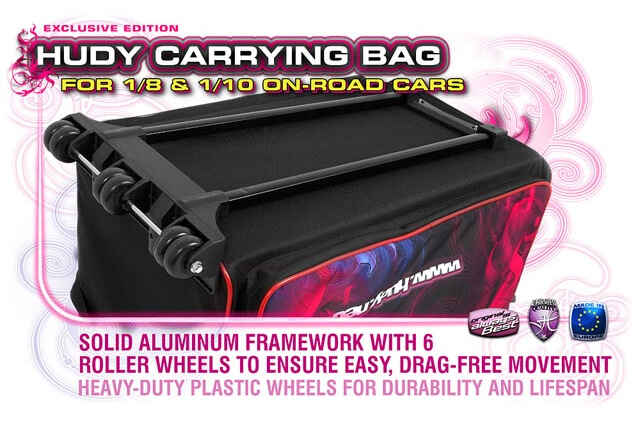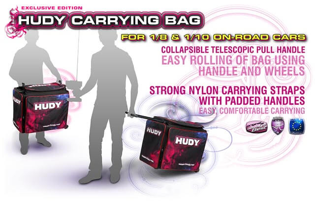 Smart, stylish and distinctive and ultra-versatile HUDY Team Carrying Bag is large and spacious enough to carry your 1/10 or 1/8 on-road RC car, tools, set-up equipment and gear to any track with comfort and ease. All walls are cushioned with protective foam, keeping your equipment safe within.