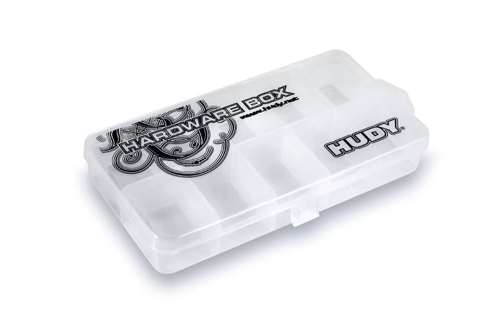 Very handy and useful box for parts storage, especially great for storing on-road shock springs. Tough, durable, translucent plastic box has 10 compartments. Easy, quick-access storage for springs. High-quality HUDY graphics.