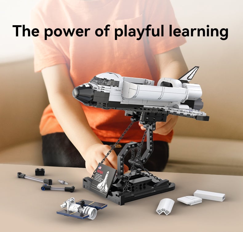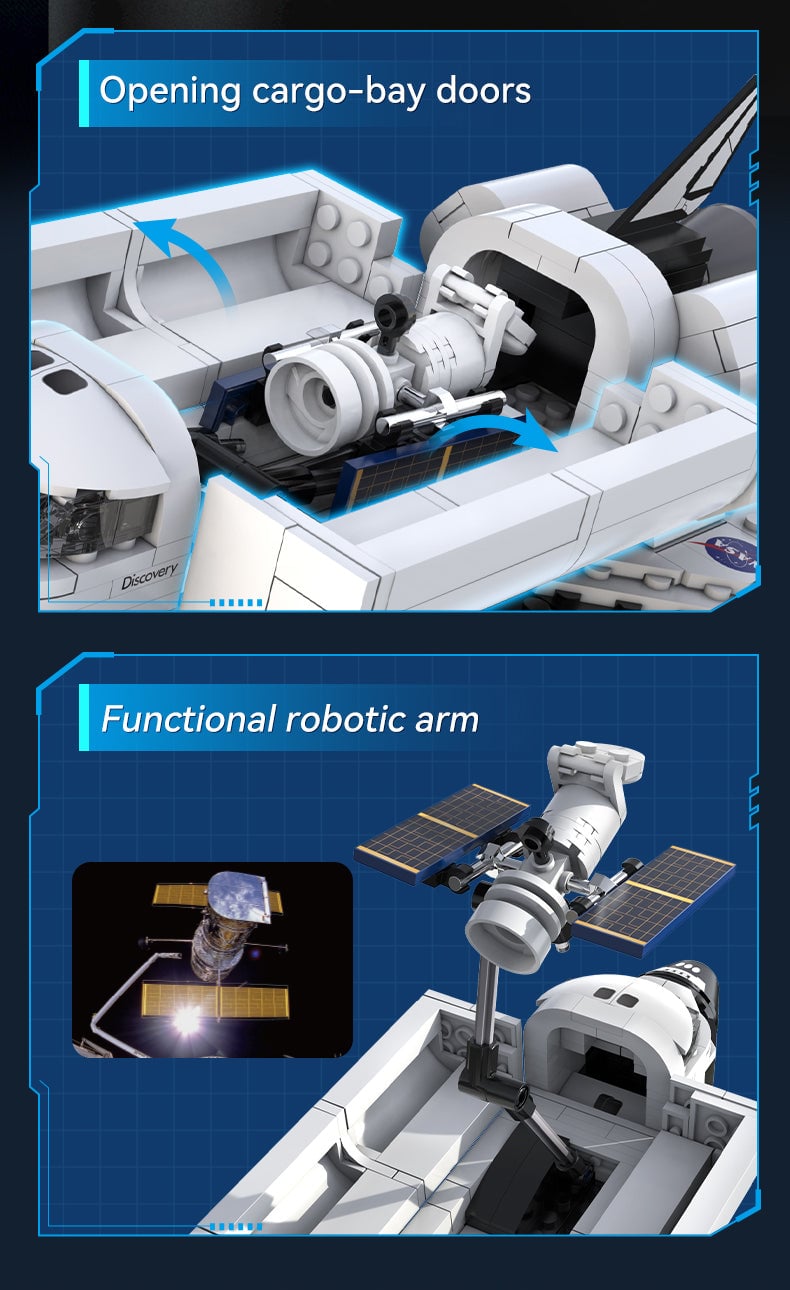 The CaDA NASA Space Shuttle Discovery set is an intricate and detailed model consisting of 475 pieces. This set captures the essence of the iconic space shuttle with remarkable accuracy. The shuttle is built on a tensegrity structure base, giving it a unique and visually striking appearance. The design includes opening cargo bay doors, revealing a spacious interior where the functional robotic arm is located. The arm can extend and retract, adding to the play experience. A satellite is attached to the arm, ready to be deployed into space. All parts of this set are printed. This set offers both an educational and entertaining experience for space enthusiasts and building bricks fans alike.