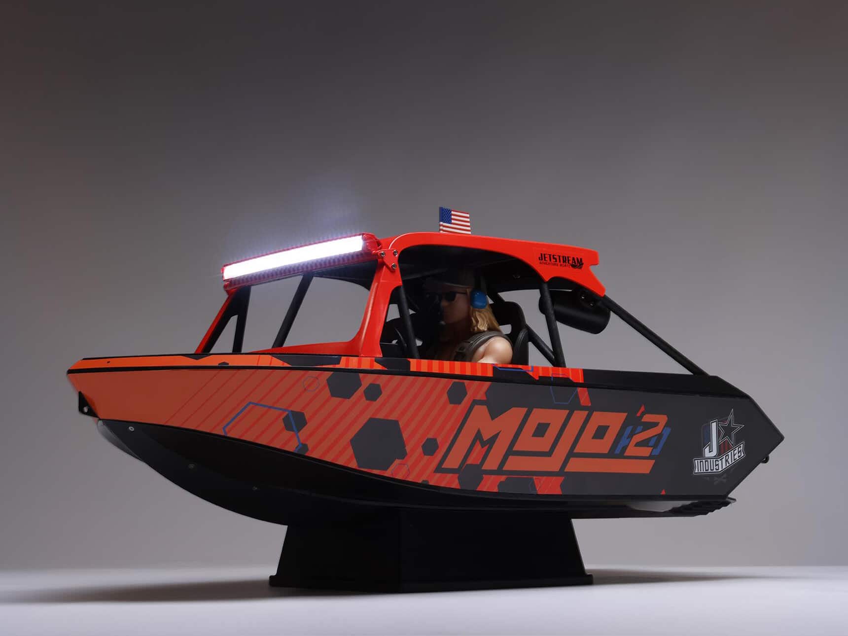 Choose from two officially licensed liveries for your Jetstream. One reproduces the awesome Blake Wilkey Death Boat. The other has the custom, high-impact graphics of the MoJo H2O livery. Check out all the realistic details included with both — roll cage, full cockpit, steering wheel, simulated speakers, and more. You can easily turn on or off the front and rear LED lighting bars, and position the pilot figure (also inspired by Mini Boat Mafia’s Blake Wilkey) in casual or driving poses. It all adds up to give your Jetstream the raddest scale looks in RC boating.