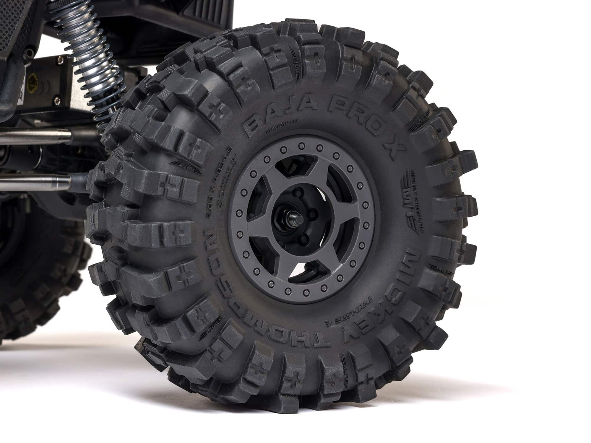 Tackle tougher terrain and more obstacles with the aggressive tread of officially licensed Mickey Thompson Baja Pro X Pro-Line OE tyres. They’re mounted on scale Pro-Line OE Holcomb 1.9 wheels, helping you to out-crawl the competition and look great doing it. Dual stage, open cell foam inserts are also included, with soft outer foam and firm inner foam to improve grip and sidewall support.