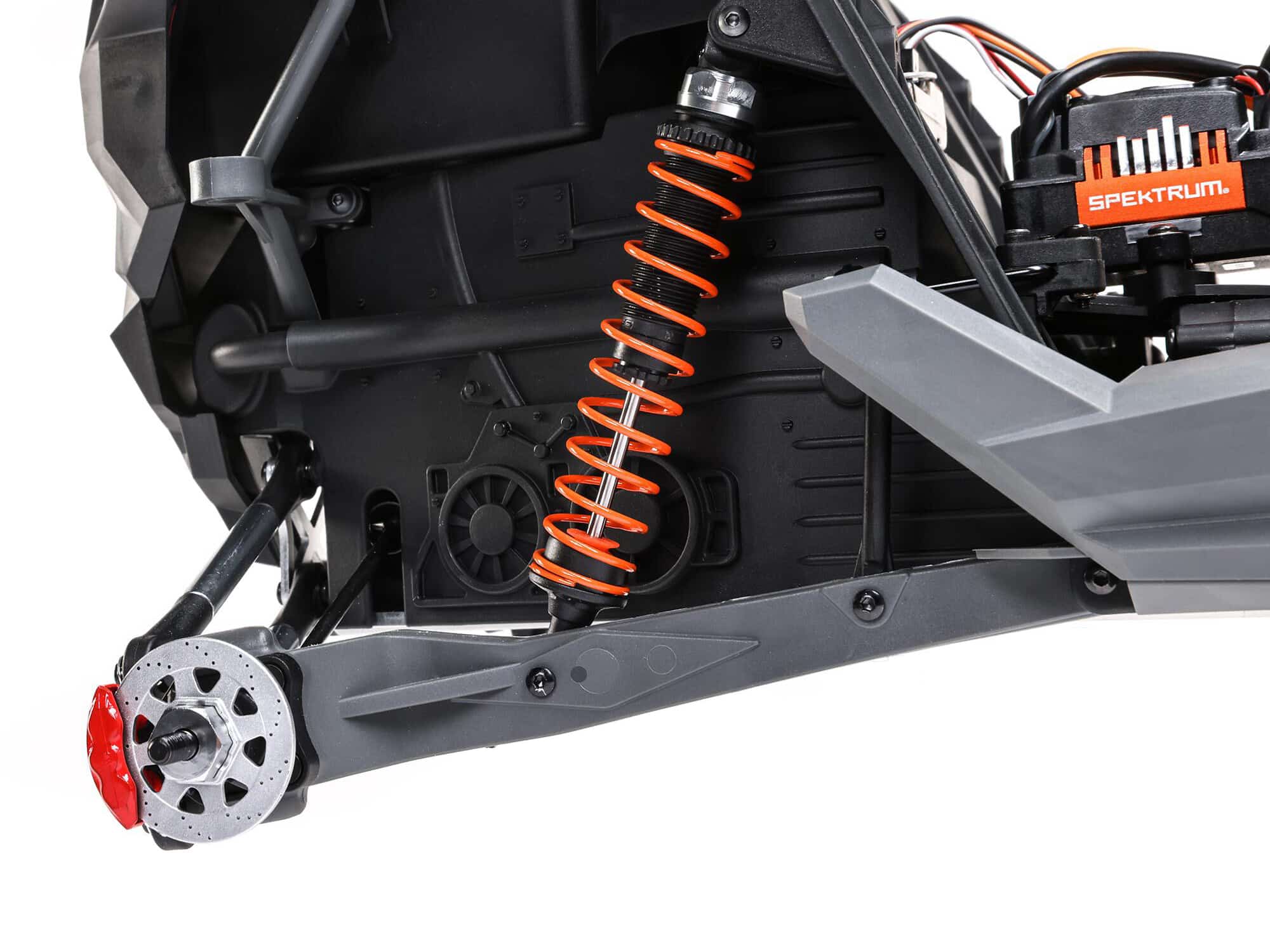 The RZR Rey’s factory-installed power system consists of a waterproof Spektrum 3800Kv brushless motor and Spektrum Firma 130A brushless Smart ESC. It’s a potent combination that handles 2S or 3S LiPo batteries (sold separately) and can blast you around the racetrack or across the dunes at speeds of 45+ mph!