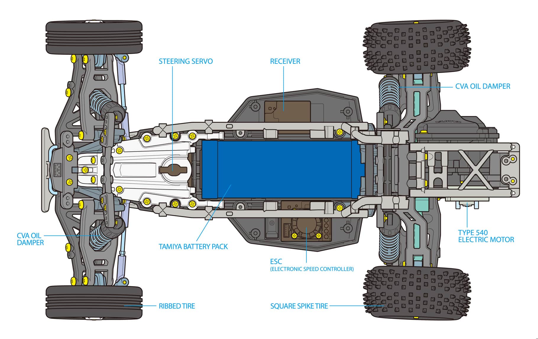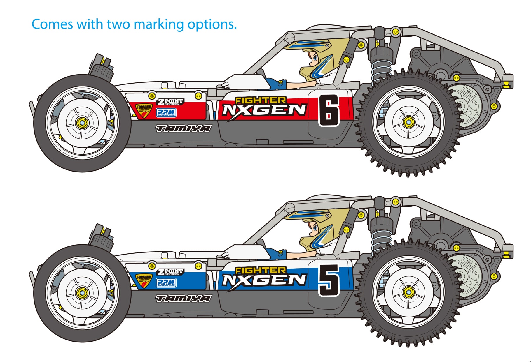 This is an R/C model assembly kit inspired by full size single-seater racing buggies popular in America. The new DT-04 – a 2WD rear wheel drive buggy chassis – of course offers ease of assembly and lively performance, which is a characteristic of this series. This product name “NXGEN” is based upon the English word “Next Generation” and as you can guess from the name, it gives improved off-road performance and a wealth of setups. Also, front and rear suspension arms, gears and gearbox are from DT-02 and DT-03 chassis cars, and option parts from DT-02 and DT-03 chassis can be used for this chassis. The body will also be an interesting part to see!