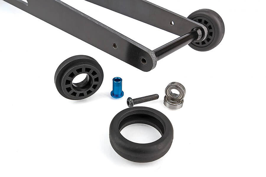 - Ball bearing wheelie bar wheels with rubber tires for increased straight-line stability