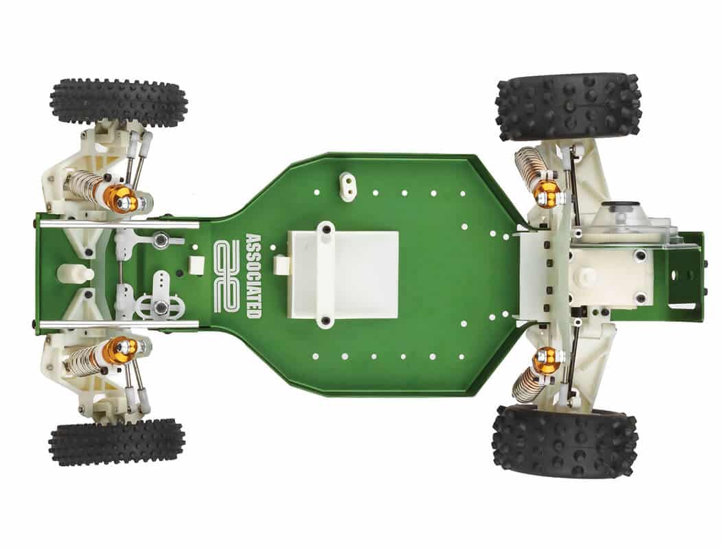 The smooth undercarriage of the RC10’s aluminum monocoque tub and special gearbox provide maximum ground clearance.