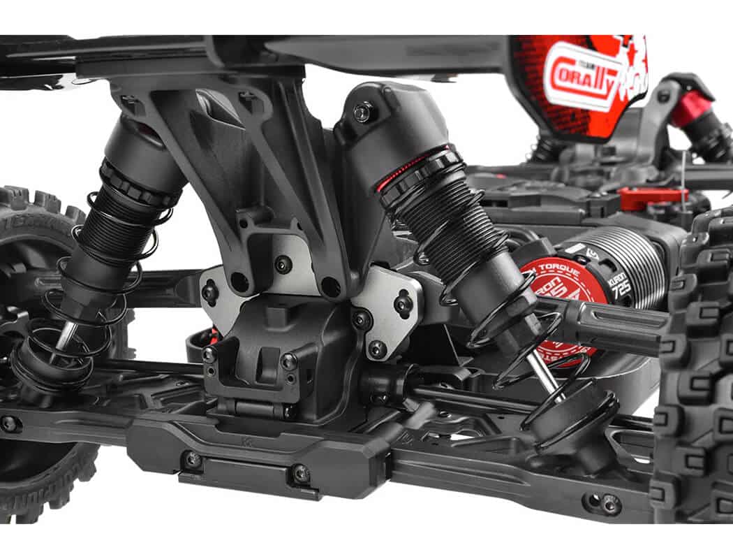 Team Corally doesn’t pull any punches when it comes to the Syncro4’s suspension system. Leveraging the well-known and bash-tested suspension arms from previous models like the Radix6 and Sketer, along with robust steering blocks and rear hubs, the Syncro4 ensures top-tier performance on any terrain. With the inclusion of the familiar 4mm CNC machined arm holders from the Spark XB6 and precision-engineered links (steering, servo, and rear upper arms), the Syncro4 maintains its commitment to durability and unparalleled performance. Even with the introduction of new plastic shocks and towers, Team Corally stands firm in delivering a suspension system that doesn’t compromise on quality, durability, or performance.