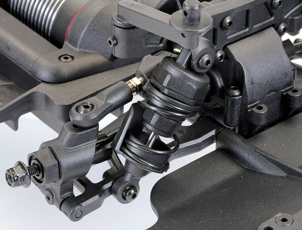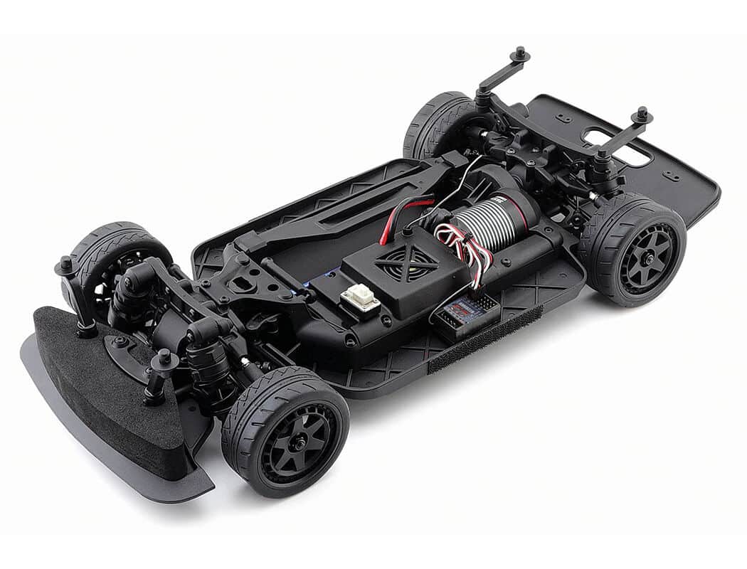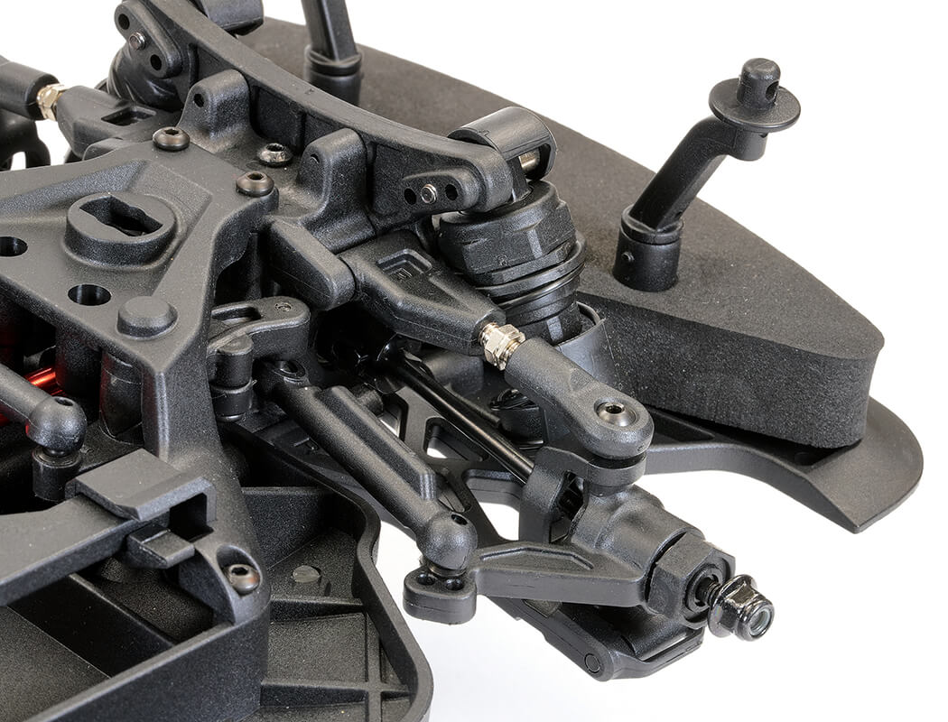 Oil filled shock absorbers, anti-roll bars and adjustable double wishbone suspension lets you tweak to suit your settings and tyre choice; either treaded rubber tyres for street racing, featuring 25mm wide front and 30mm wide rear for better stability at high speed or hard plastic boots on 6-spoke wheels for sideways drift driving.