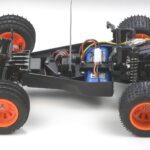 This tough, lightweight ABS bathtub chassis features a rear-mounted motor, rear-wheel drive layout. Fully-enclosed gearbox protects against dirt and debris and is equipped with differential gears to offer smooth cornering. 4-wheel independent double wishbone suspension is equipped with C.V.A. shock units and extremely durable monocoque-type lower arms. The front spiked tires feature three ribs for enhanced stability while the rear tires feature both spikes and an X-shaped tread pattern along the centre to ensure high levels of grip.