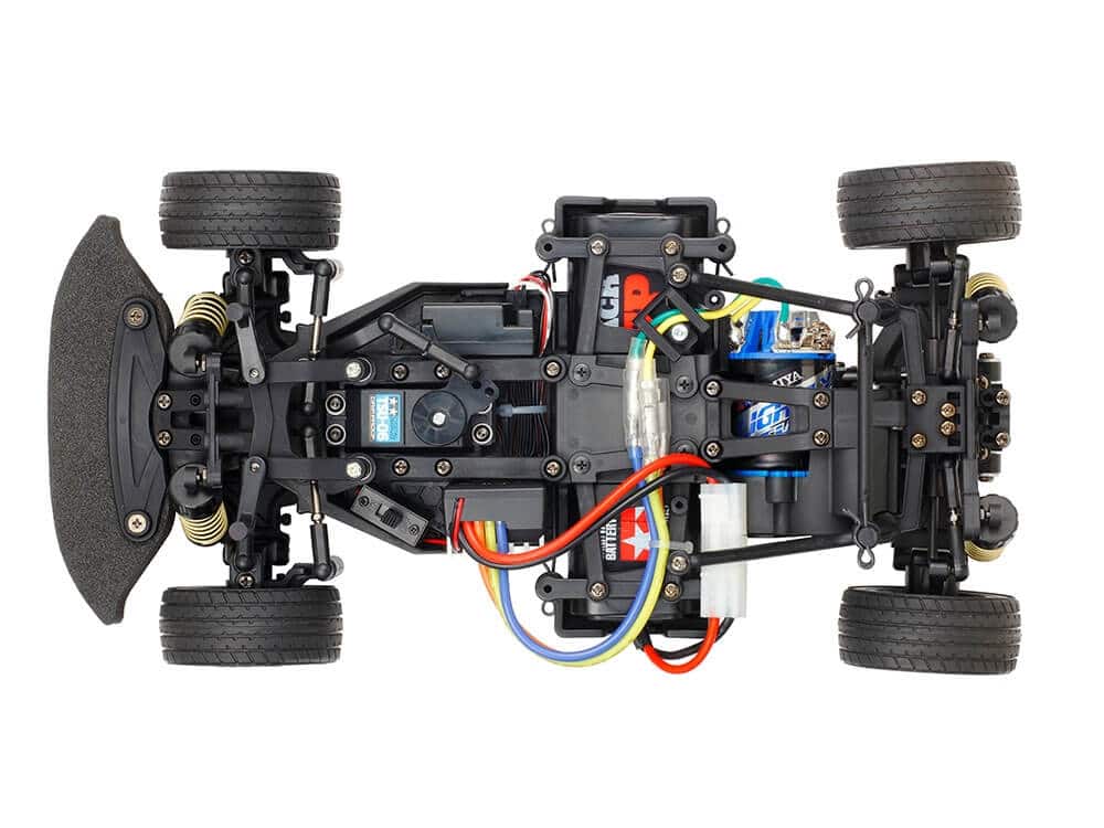 This TAMIYA high-performance rear-wheel drive R/C chassis assembly kit is constructed around a rigid monocoque