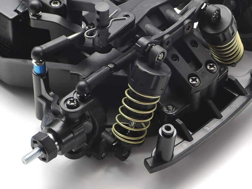 This TAMIYA high-performance rear-wheel drive R/C chassis assembly kit is constructed around a rigid monocoque with the main frame split into front and rear sections. It offers superior rear high traction drive characteristics and fuss-free maintenance of parts such as the easy-access differential. C.V.A. (Constant Volume Adjustable) oil shock-damped 4-wheel double wishbone suspension features dedicated long arms and steering linkage components for a range of setup options. A silky-smooth drivetrain utilizes full ball bearings, oil-filled gear differential unit and universal drive shafts. It can be assembled with a 210mm (S), 225mm (M) or 239mm (L) wheelbase, making it compatible with appropriately-sized existing Tamiya M-chassis body parts sets.