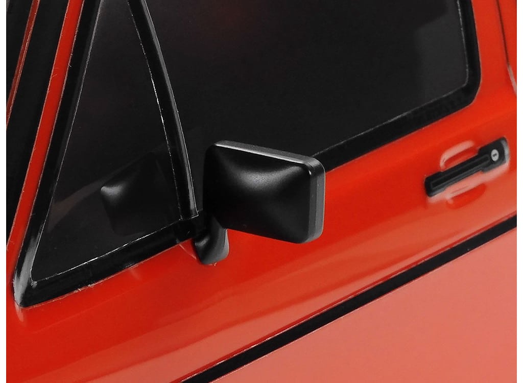 - Separate plastic parts moulded in black realistically depict side mirrors and bumpers