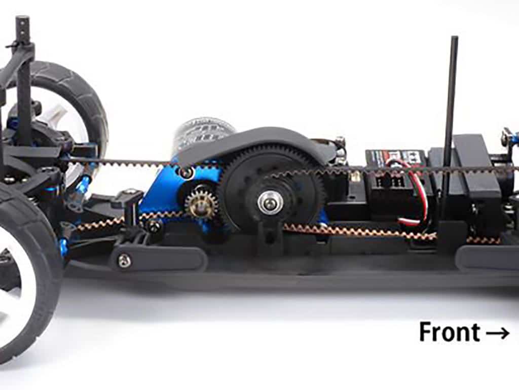 • The battery pack and servo are positioned on a slight angle (about 10 degrees) to reduce surface contact while cornering and facilitate optimum weight distribution.