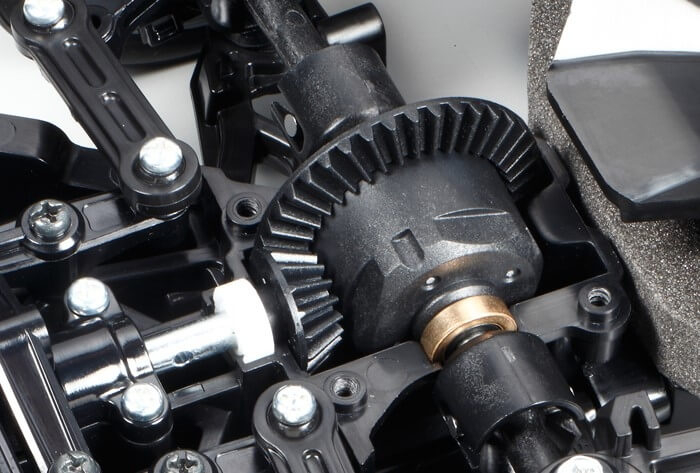 Adaptable TT-02 Chassis offers balanced shaft driven 4WD.