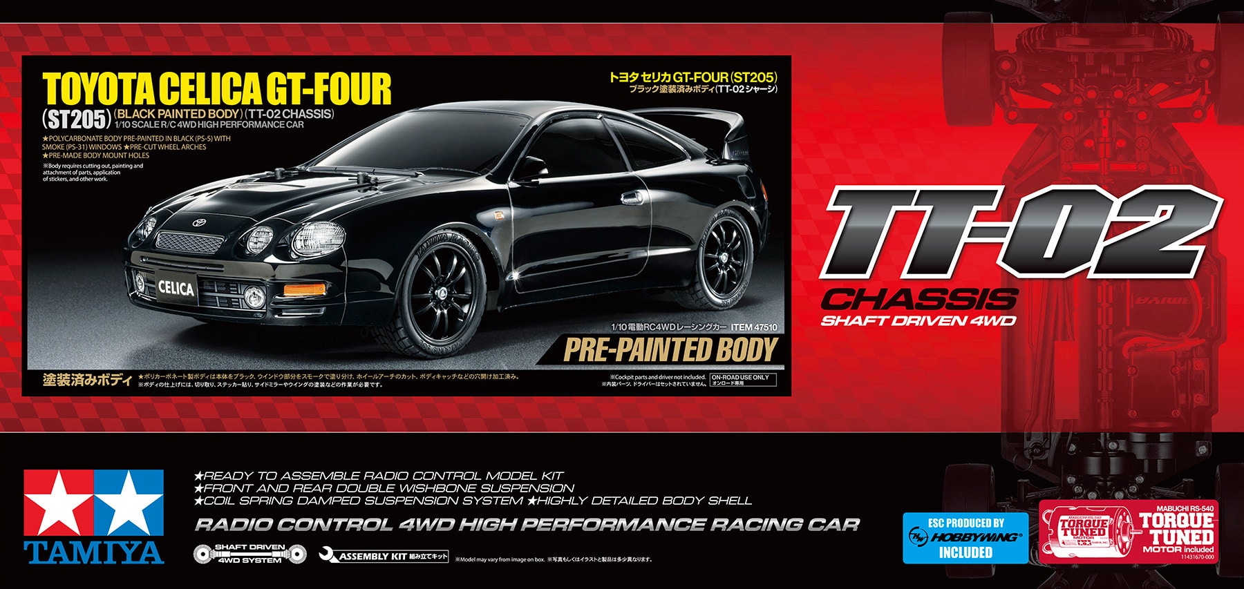 Tamiya welcomes this limited edition version of Item 58743 1/10 R/C Toyota Celica GT-FOUR (ST205) (TT02) with the polycarbonate body pre-painted in Black (PS-5) with Smoke (PS-31) windows, with pre-cut wheel arches and pre-made body mount holes, which is great for not only beginners but also R/C veterans.