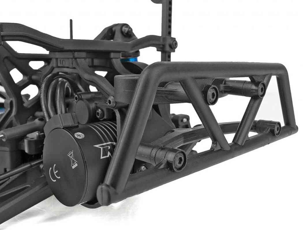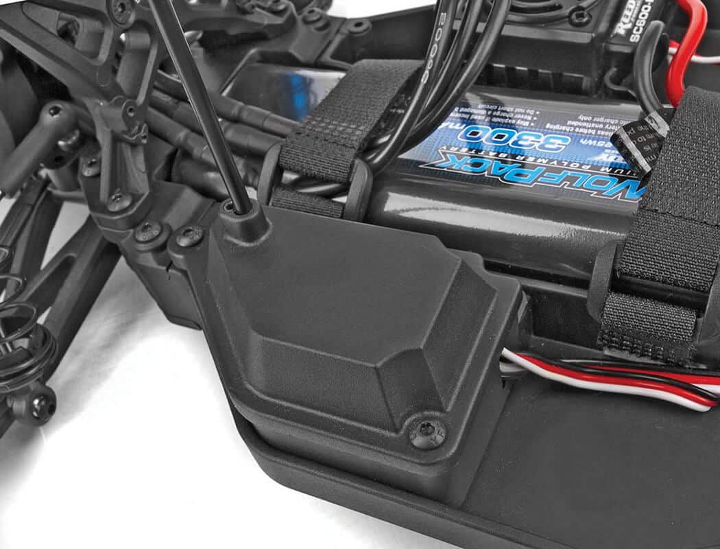 - Low center-of-gravity molded composite chassis with hook-and-loop battery straps that accommodate both NiMH and 2S or 3S LiPo battery packs