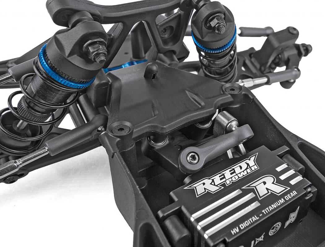 - New mid-motor low center-of-gravity G10 fiberglass chassis with updated O-Ring battery straps that accommodate 2S LiPo “shorty” battery packs