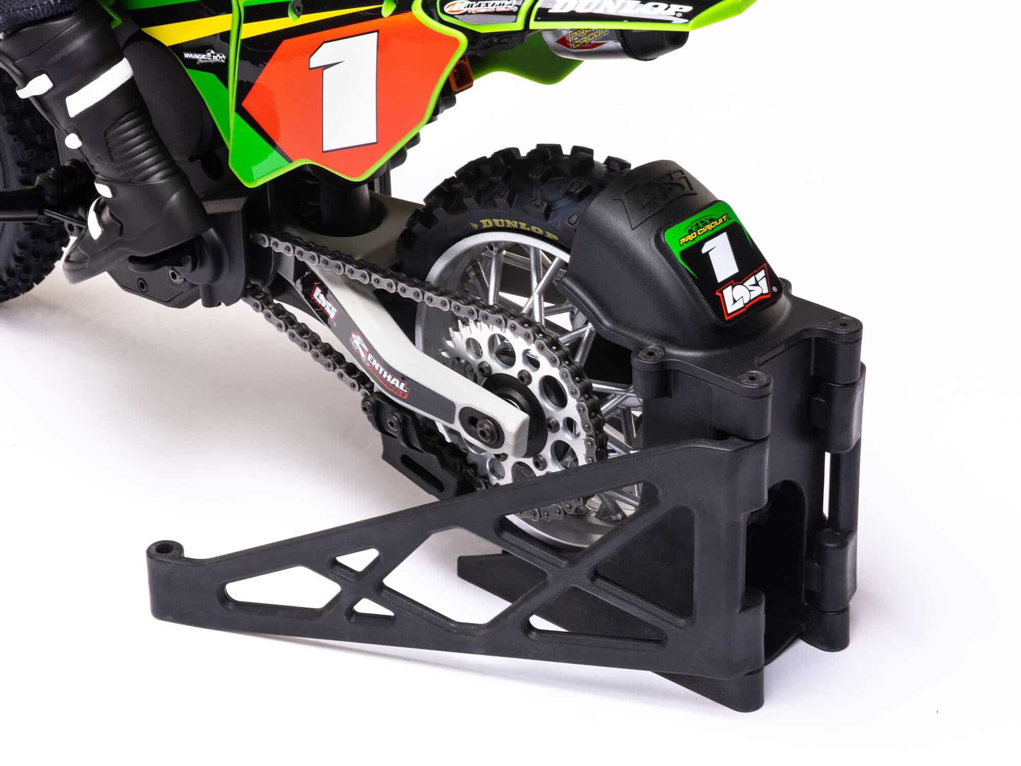 Losi partnered with the highly successful Pro Circuit supercross race team to create the officially licensed graphics for the Promoto-MX. Since 1991, Pro Circuit has fielded the strongest, most consistent team on the AMA Supercross circuit. Going back to its first starting lineup, over 50 riders have ridden for the Pro Circuit race team, collectively earning an impressive 31 AMA Championships and six MXoN victories.