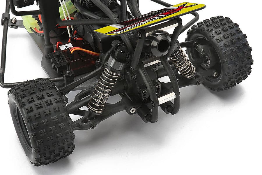 Featuring a hard ABS moulded cab and entertaining cartoon style ‘bobbing head’ driver figure the Flamingo is available in a choice of three vivid colours. A steel roll bar runs around the outer edge of the chassis to help prevent tipping during hard turns even though you will lift rear wheels and drift! Mounted to a thick 6061 aluminium main chassis the 370 brushed motor, gearbox with heady-duty metal gears and 800mAh battery are all neatly housed under the cab and a special immitation engine block with moulded exhaust.