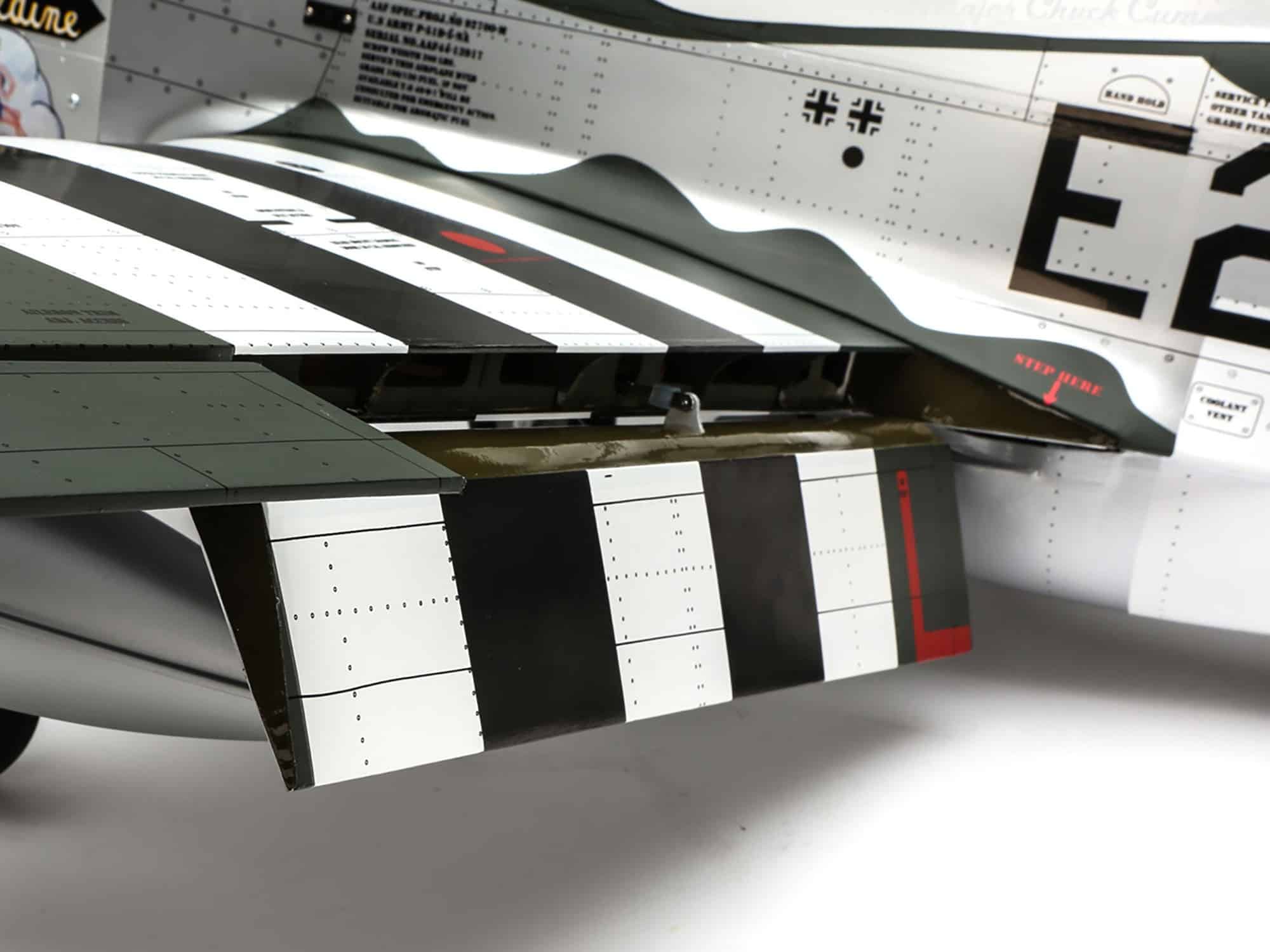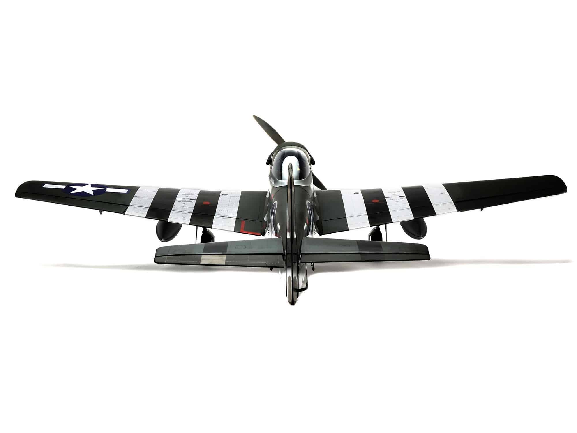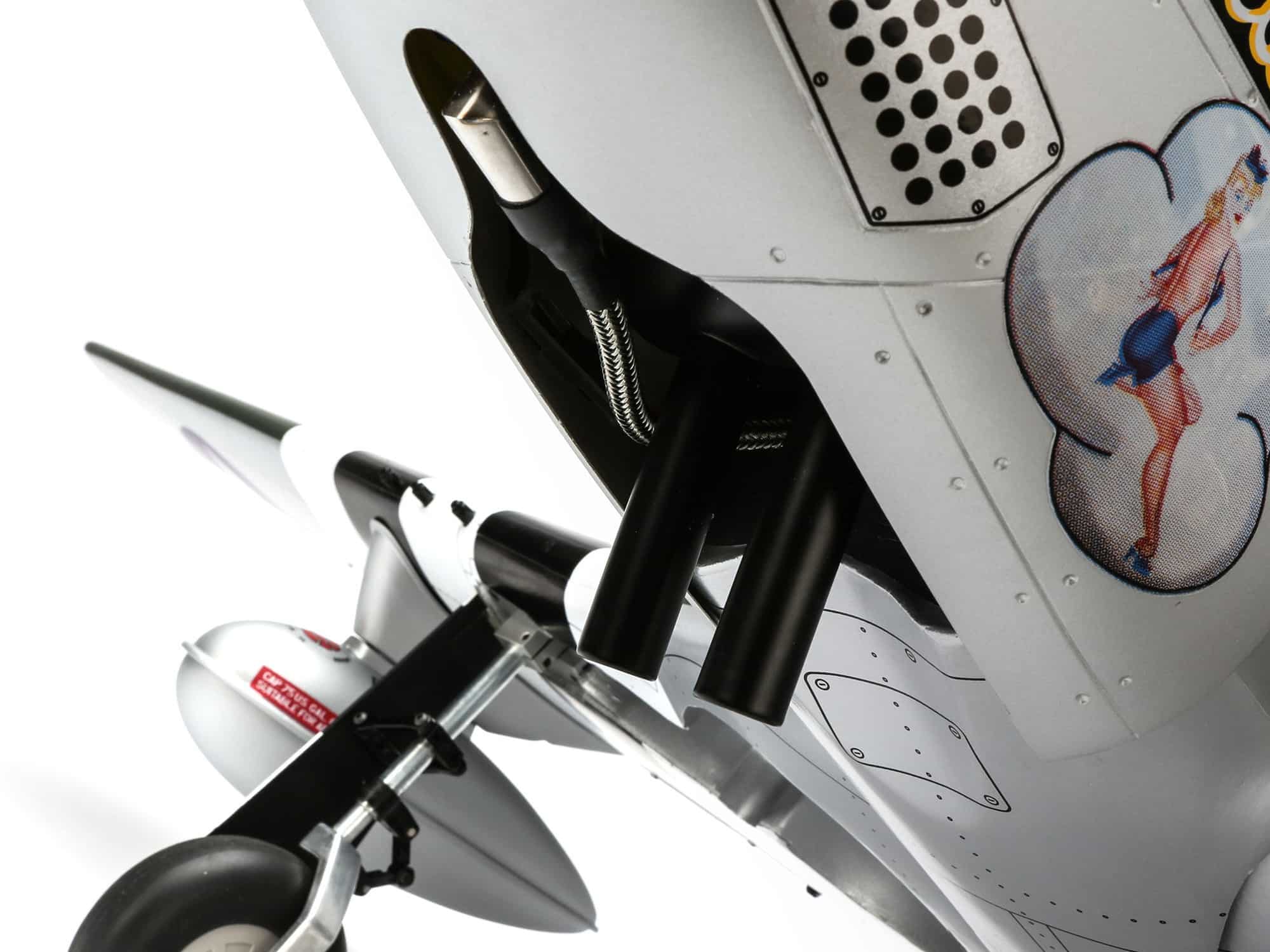 Beyond the factory applied satin-finish printed covering, other iconic details include airfoil-shaped tail surfaces, realistic engine exhaust, wing guns, gear doors, optional-use drop tanks, radio antenna, a 3D instrument panel and a painted pilot figure.