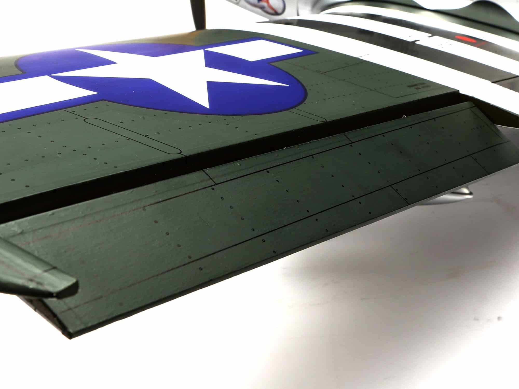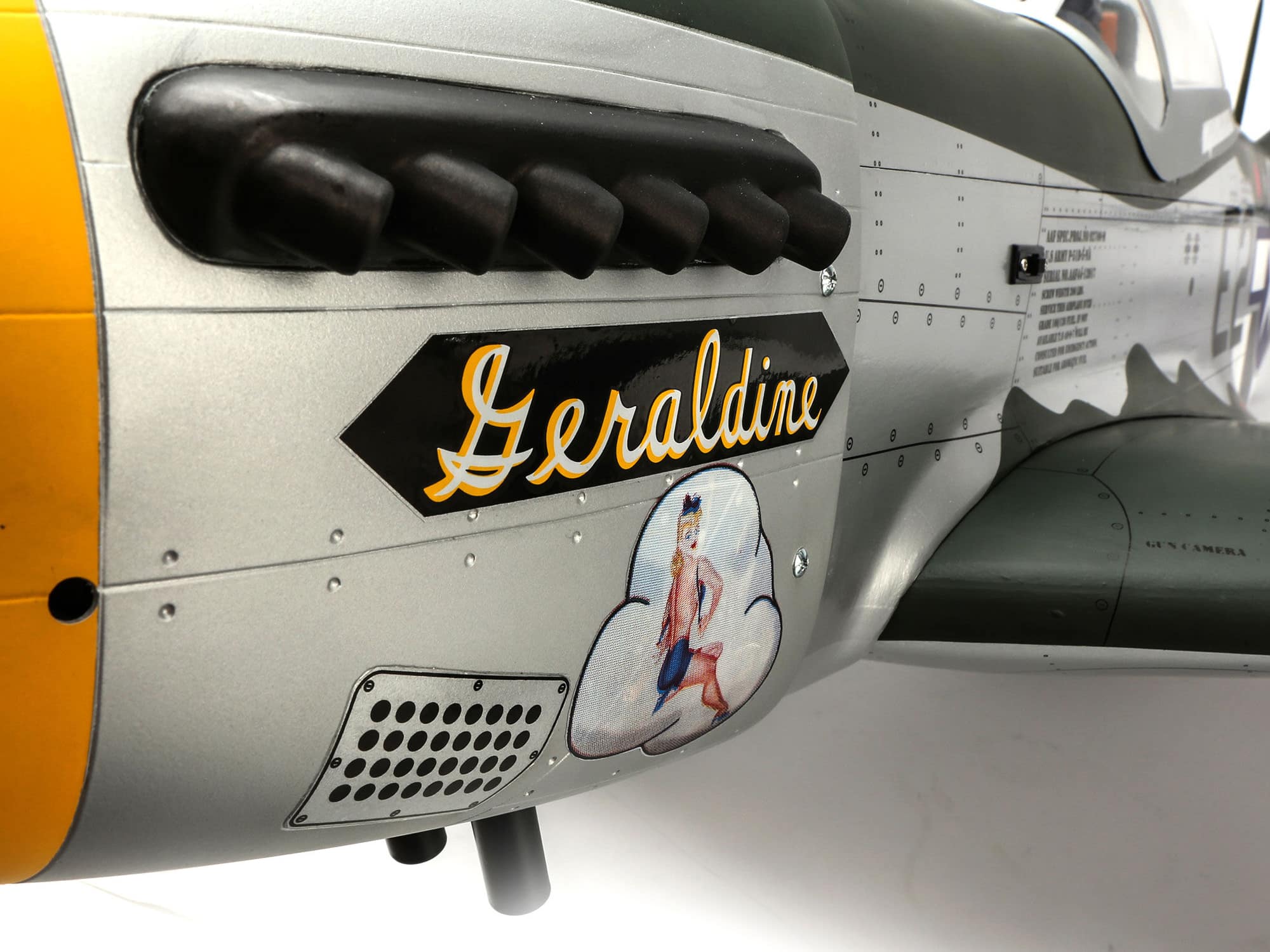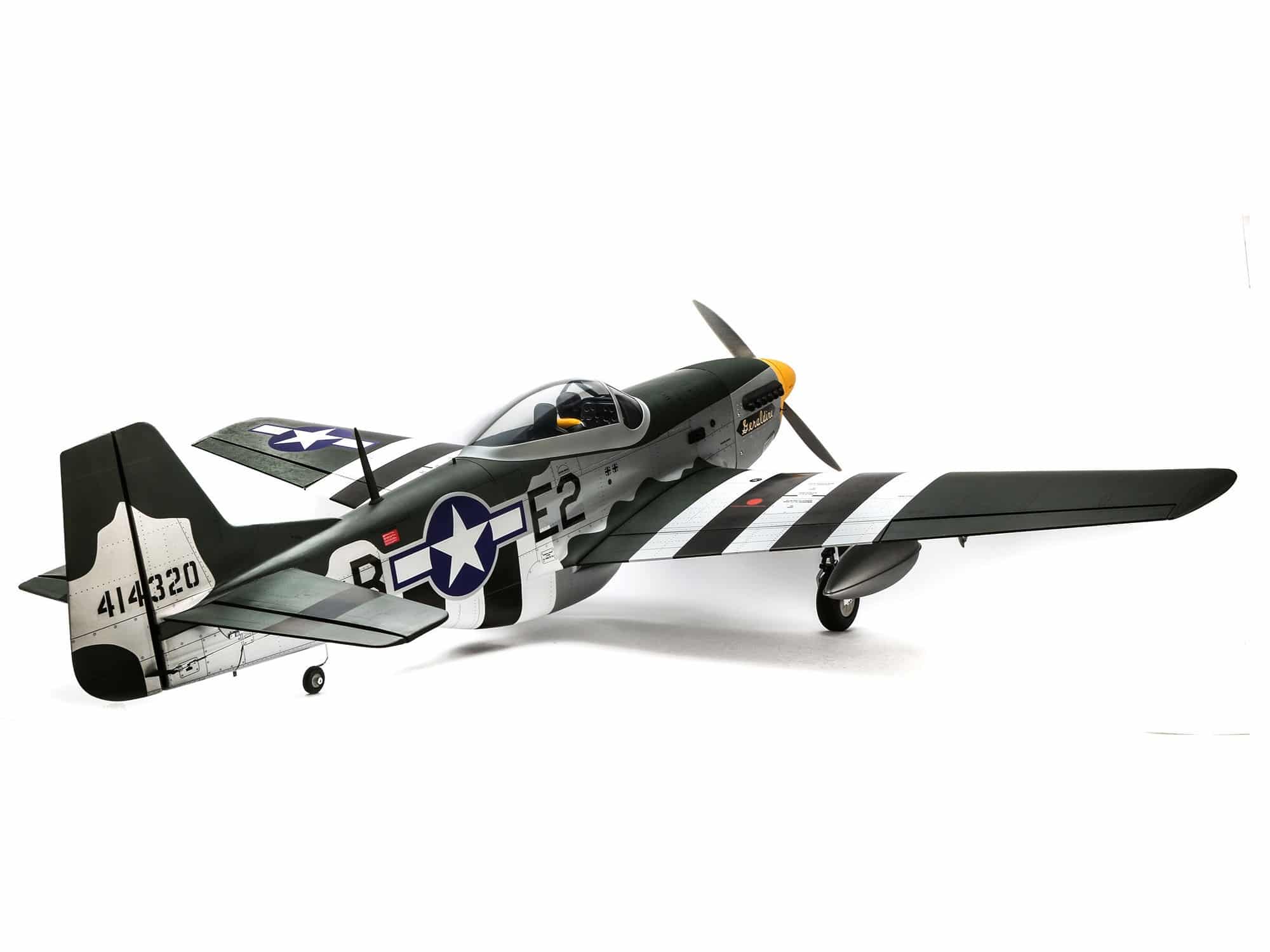 Beyond the factory applied satin-finish printed covering, other iconic details include airfoil-shaped tail surfaces, realistic engine exhaust, wing guns, gear doors, optional-use drop tanks, radio antenna, a 3D instrument panel and a painted pilot figure.