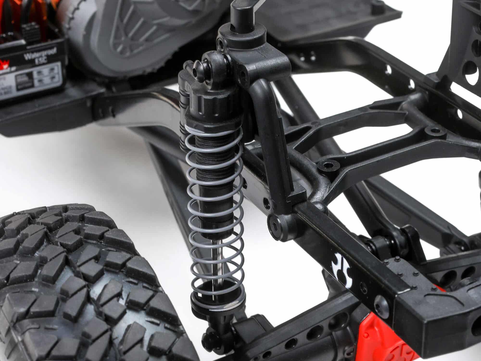 The oil-filled shocks have threaded bodies and a single coilover spring. The dampening rate can be tuned to meet the demands of the trail. Realistic shock hoops with multiple mounting positions let you adjust your suspension for maximum performance.