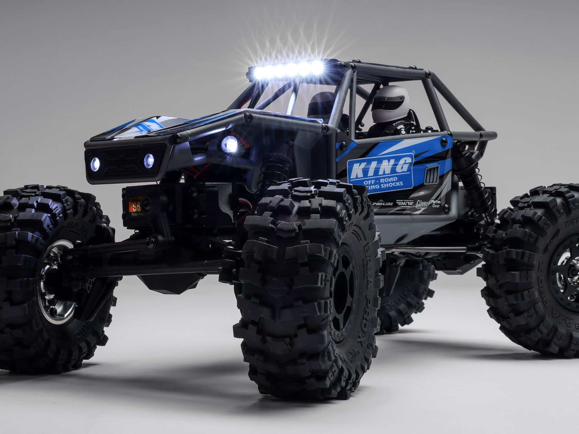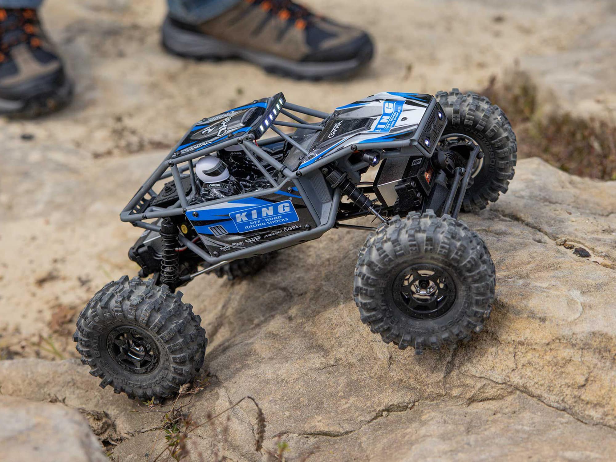 The scaled-down Capra tube chassis adds realistic trail buggy looks, with helmeted driver and passenger figures, LED headlights, rock lights, and light bar. Choose from two new paint scheme and livery options. One has a gray cage and blue body panels with licensed King Shocks livery. The other has a black cage and yellow body panels with licensed Mickey Thompson Tyre livery.