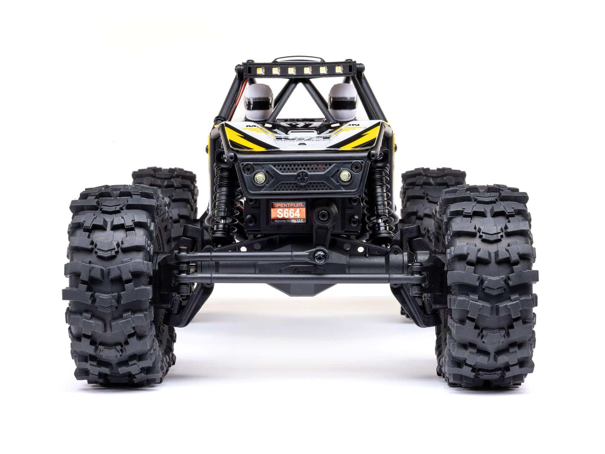 Axial highlights the 1/18 scale realism with working LED headlights, light bar, and forward facing rock lights for crawling after the sun sets.