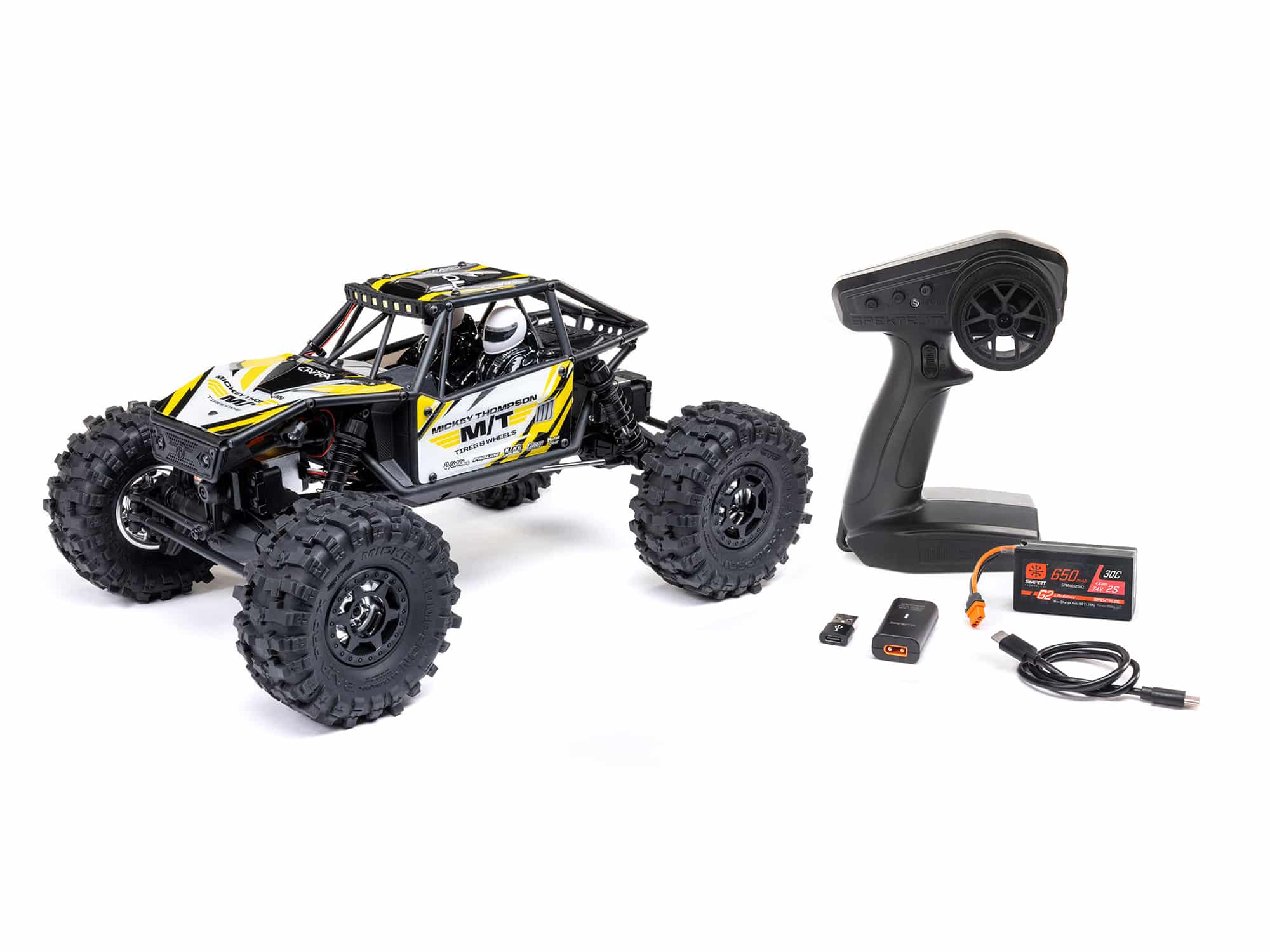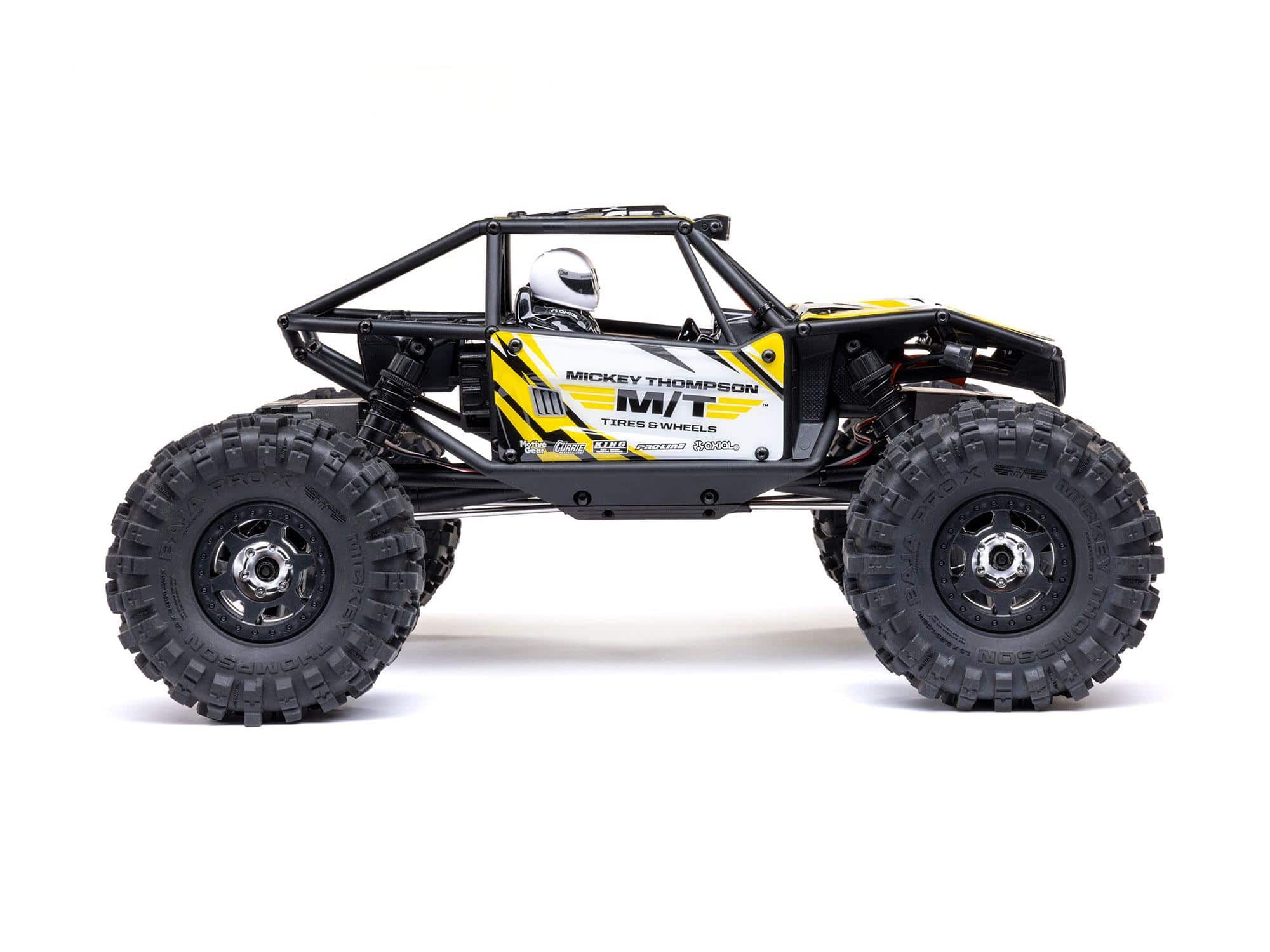 The scaled-down Capra tube chassis adds realistic trail buggy looks, with helmeted driver and passenger figures, LED headlights, rock lights, and light bar. Choose from two new paint scheme and livery options. One has a gray cage and blue body panels with licensed King Shocks livery. The other has a black cage and yellow body panels with licensed Mickey Thompson Tyre livery.