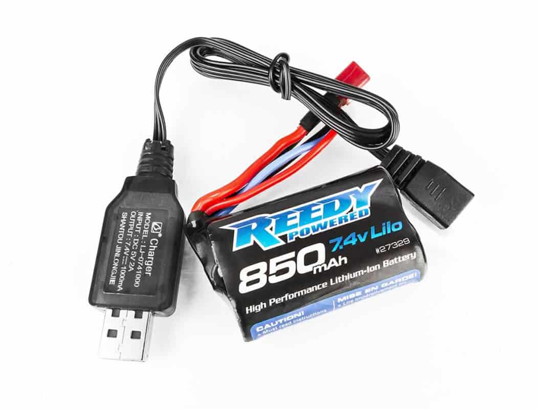 • 850mAh Li-Ion 7.4V 2-cell battery and charger.