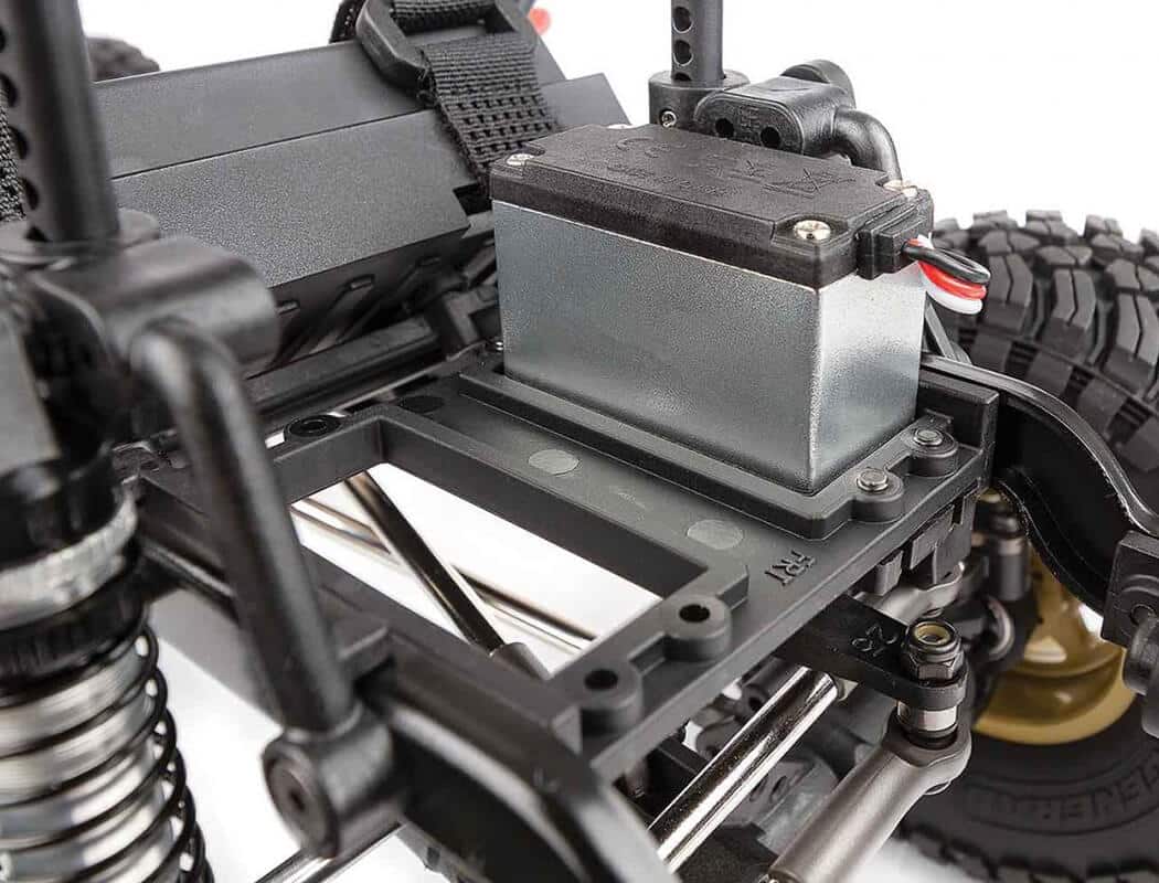 Integrated Servo Winch Mount: Mounting a winch directly to the chassis is the strongest and most reliable spot on any trail rig. Positioned alongside the steering servo for overall chassis balance and weight distribution.