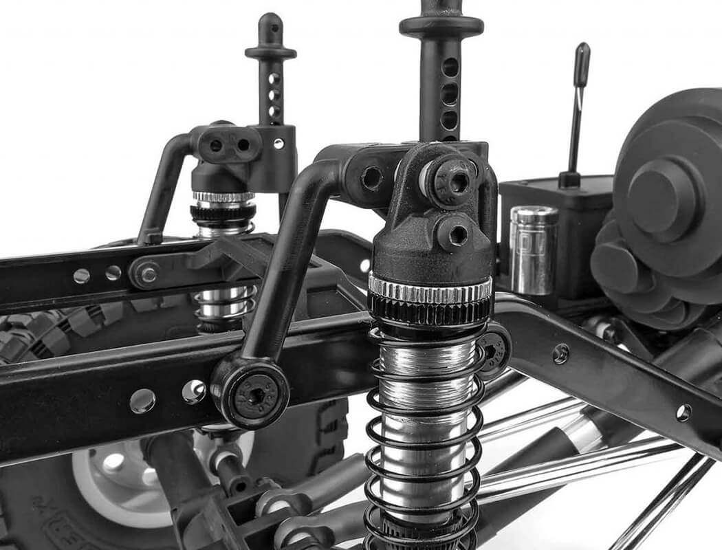 Threaded Aluminium Shock Bodies: Threaded aluminium and fluid-filled, these shocks come with plastic collars and bleeder caps for easy tuning. Perfect for keeping the vehicle stable on the trail and retaining oil even in the roughest terrain.