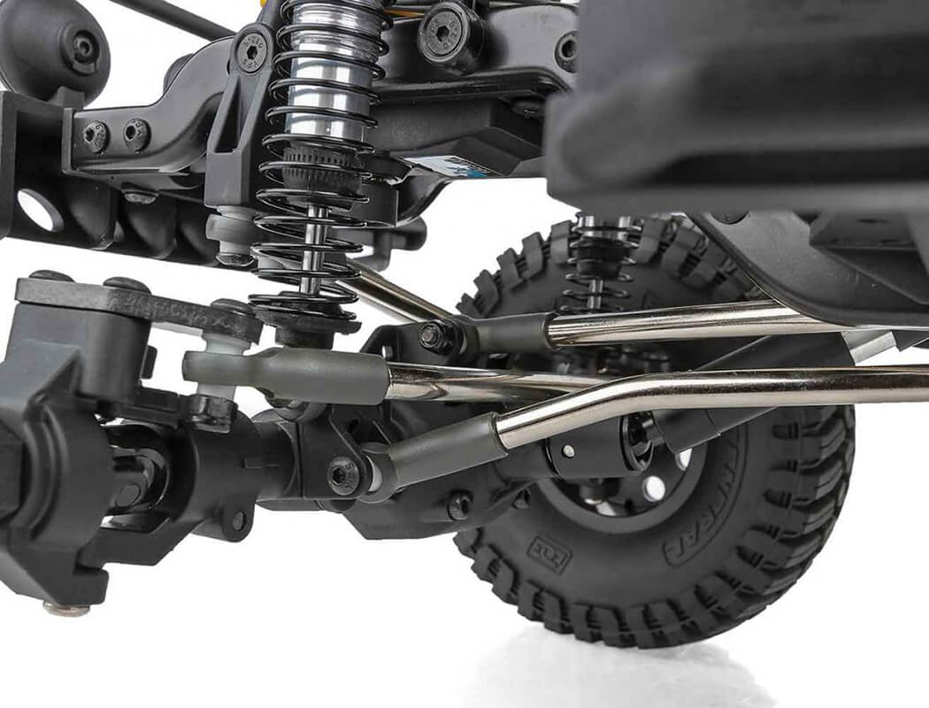 BTA Steering & Aluminium Steering Plates: Behind-the-axle steering provides better approach angles, more clearance, and a cleaner look. The Factory Team high-clearance lower links provide better clearance when climbing over rocks and rough terrain.