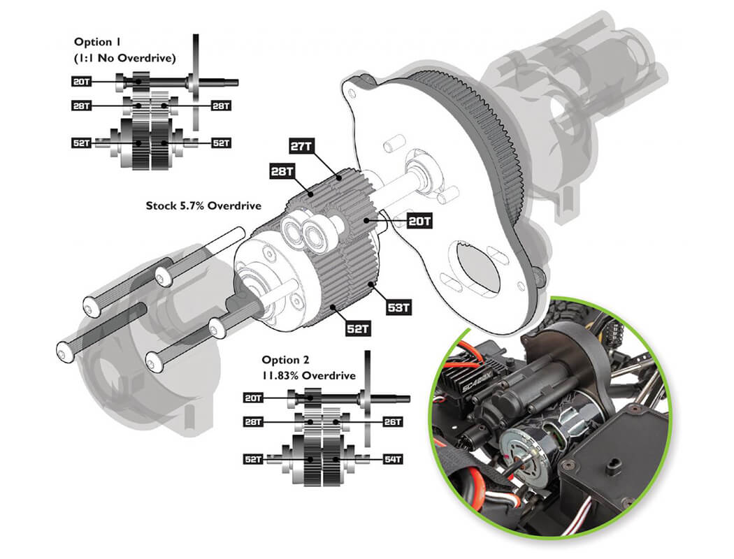 At the heart of the Enduro is our revolutionary StealthR X gearbox. Although the exterior appears to have a conventional 3-gear transmission look, the inside is far from conventional. The Stealth X features the ability to adjust the rear drive ratio independently of the front drive across three levels: stock overdrives the front end 5.7% (installed in RTR), option 1 provides a one-to-one drive ratio front-to-rear (available separately), and option 2 overdrives the front end 11.83% (included with RTR).