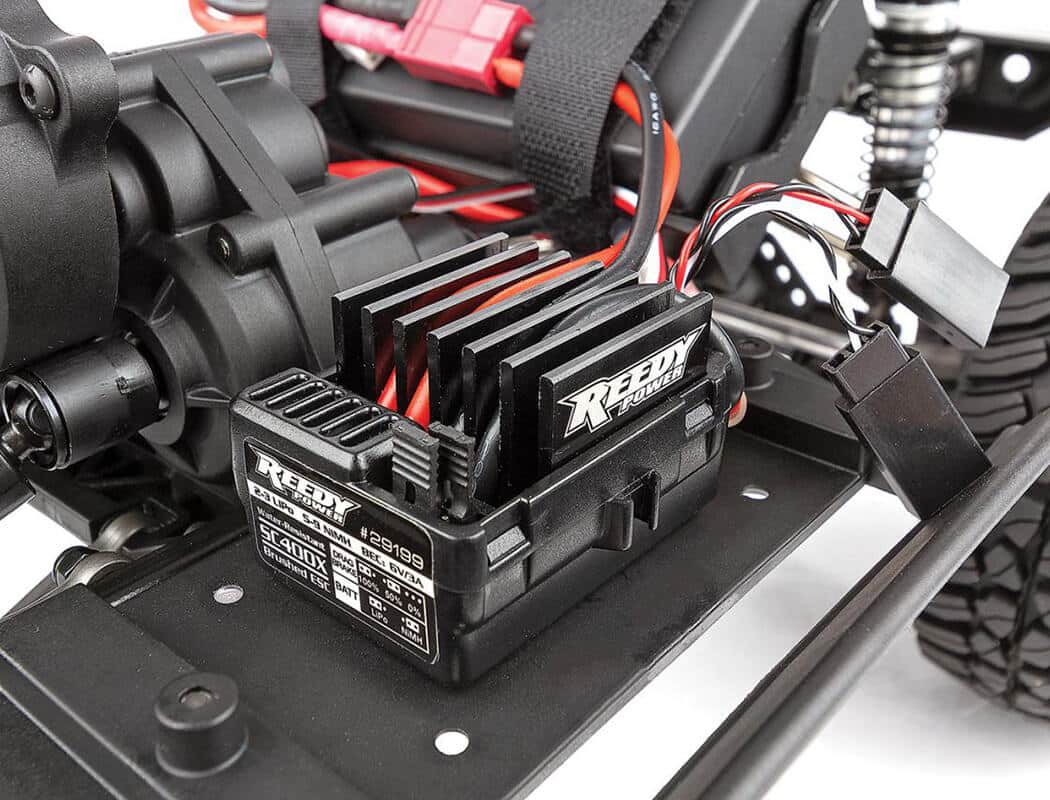 Reedy Power Electronic Speed Controller (ESC): The water resistant SC480X brushed ESC is specifically programmed for crawling with proportional forward/reverse, dual auxiliary power output leads, LiPo low-voltage cutoff protections, and T-plug connector.