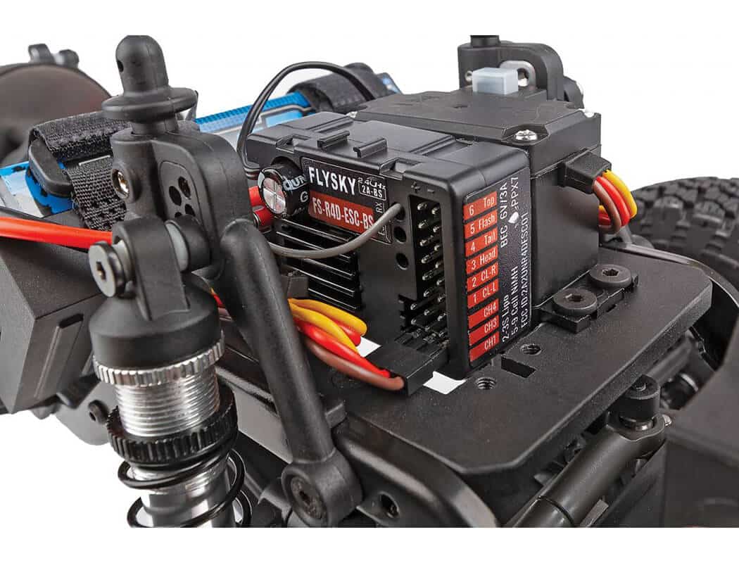 Flysky 2-in-1 ESC/Receiver Unit: This RTR comes equipped with a Flysky 2-in-1 brushed electronic speed control (ESC) and receiver unit with built-in LED lighting controller.