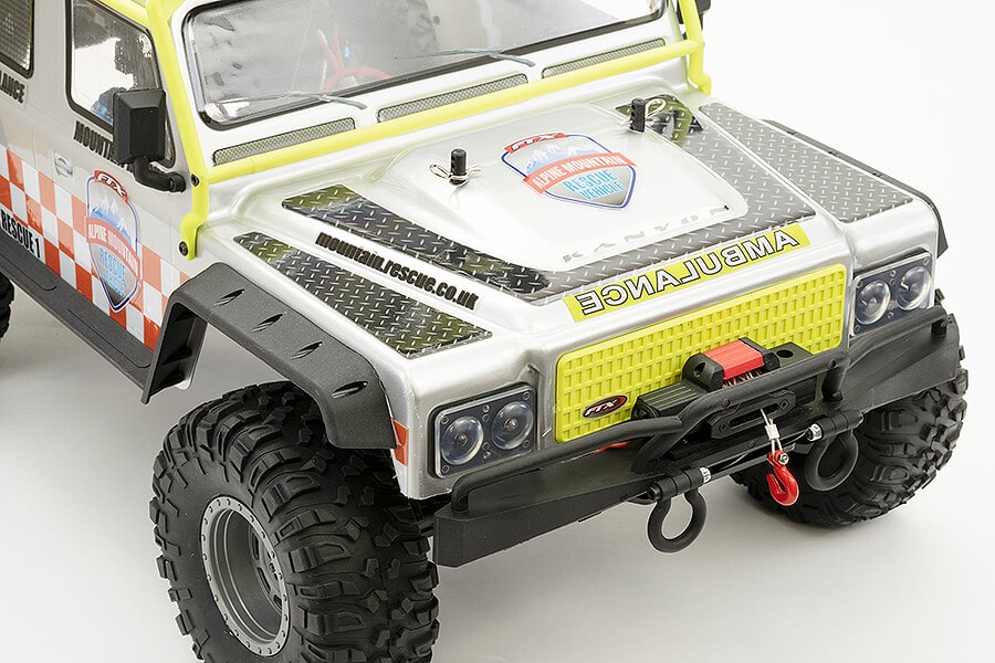 FTX’s new Mountain Rescue edition Kanyon looks to capture the go anywhere mindset of rescue teams by including some new features over the standard Kanyon. A switchable 2-speed gearbox provides high and low speeds to help navigate rough and smooth terrain, whilst a front bumper mounted winch can be operated from the transmitter to haul you out of trouble.