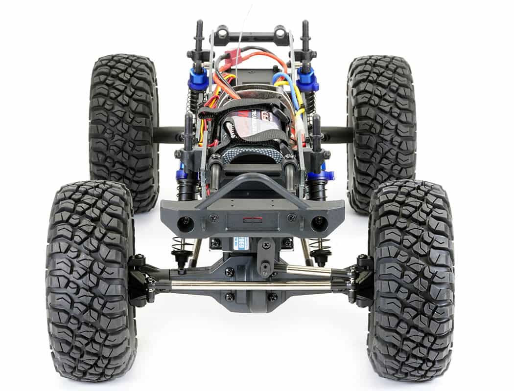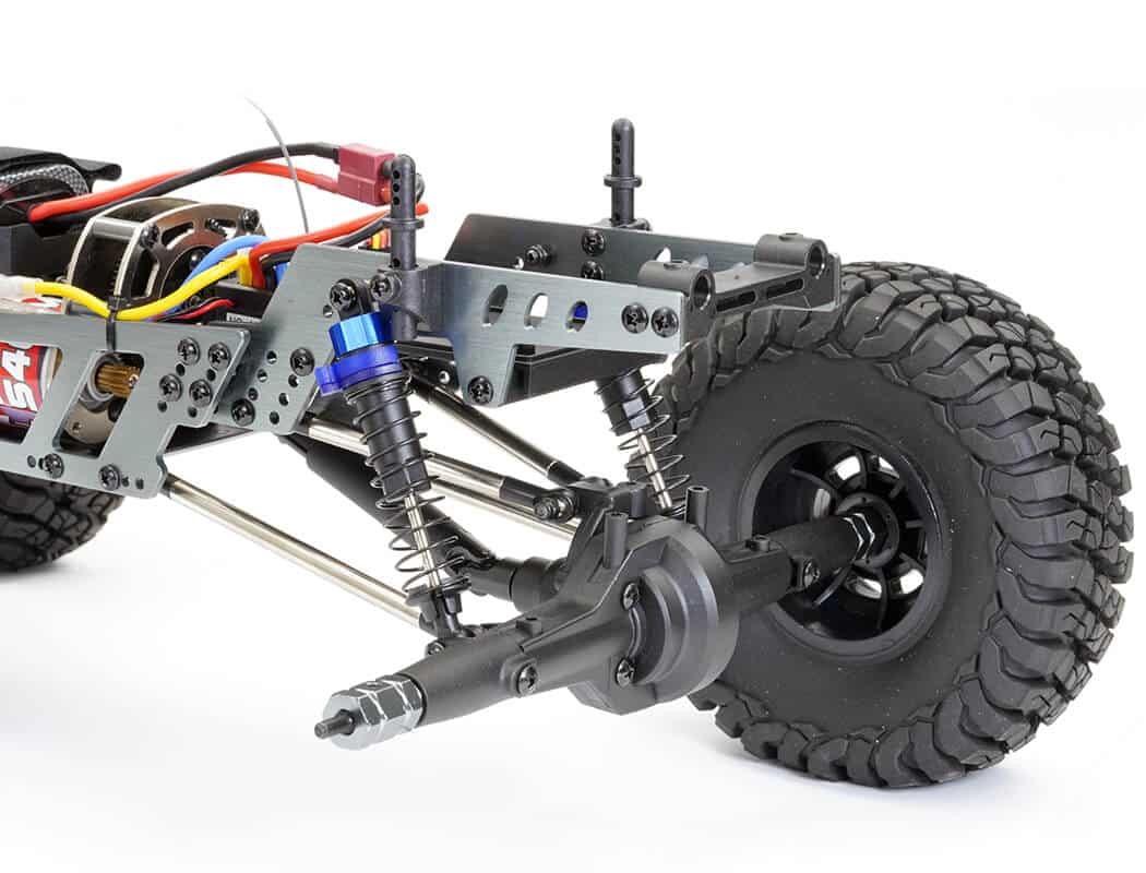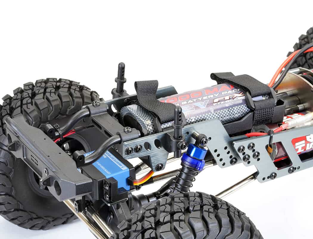 Tall 2.2”, high profile, super-size, and super-soft all terrain block tyres with memory foam provide fantastic trac­tion and drive on the most testing of rocky surfaces. Now updated to an Etronix 15kg waterproof metal geared servo, the Mauler can navigate the harshest of terrain. The heavy-duty steel multi-link suspension provides exceptional articu­lation, which can be finely tuned via a series of mounting positions for the shock absorbers, links and chassis plates providing a multitude of angles and different wheelbases. Even battery and speed control can be relocated front or rear for custom tuning.