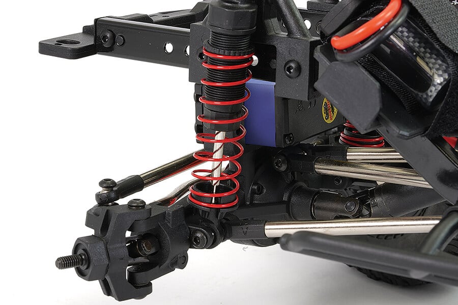 A powerful Etronix 6kg rated waterproof steering servo, along with an improved 45° steering angle, paired with adjustable front caster angle provides exceptional manoeuvrability in tight spaces. The 1500mAh battery has been moved forward for improved stability, while the oill filled shock absorbers now featured threaded bodies for fine tuning adjustment.