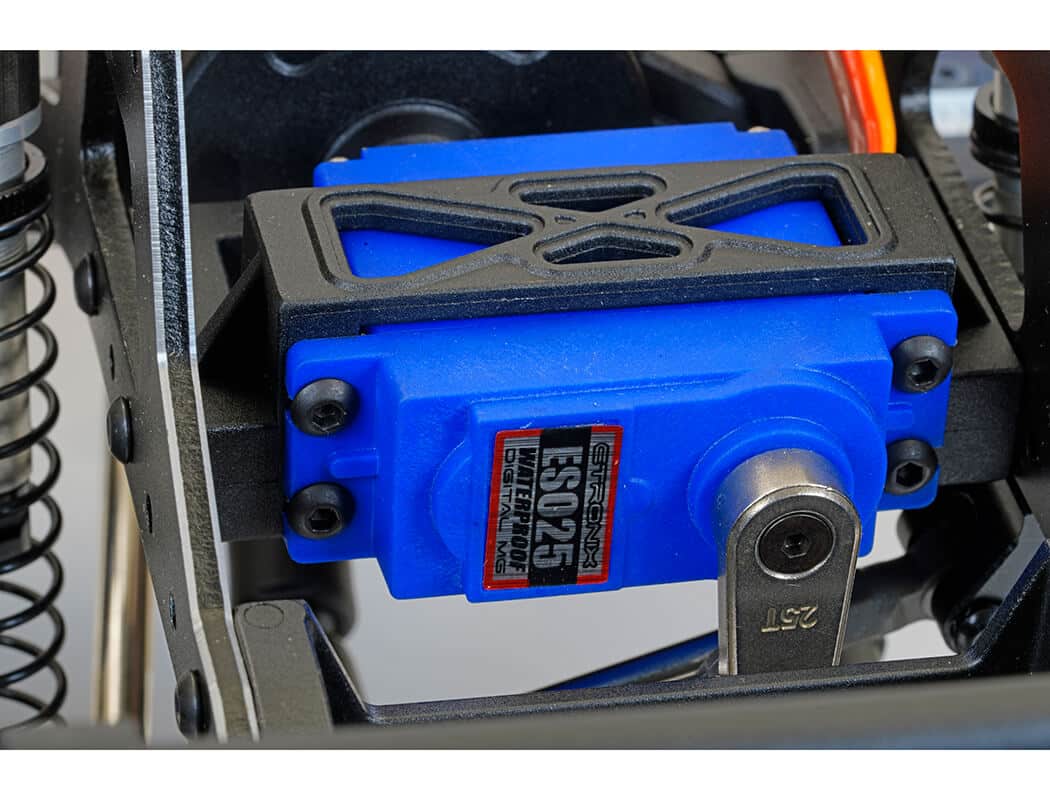The Trooper uses a waterproof, metal geared 25kg rated steering servo, along with the option to mount a winch servo should you wish to upgrade. A 60amp rated 2-in-1 speed control and 6-channel radio provide the control, while a 35T 550 sized brushed motor and 2000mAH 2S LiPo battery supply the power.