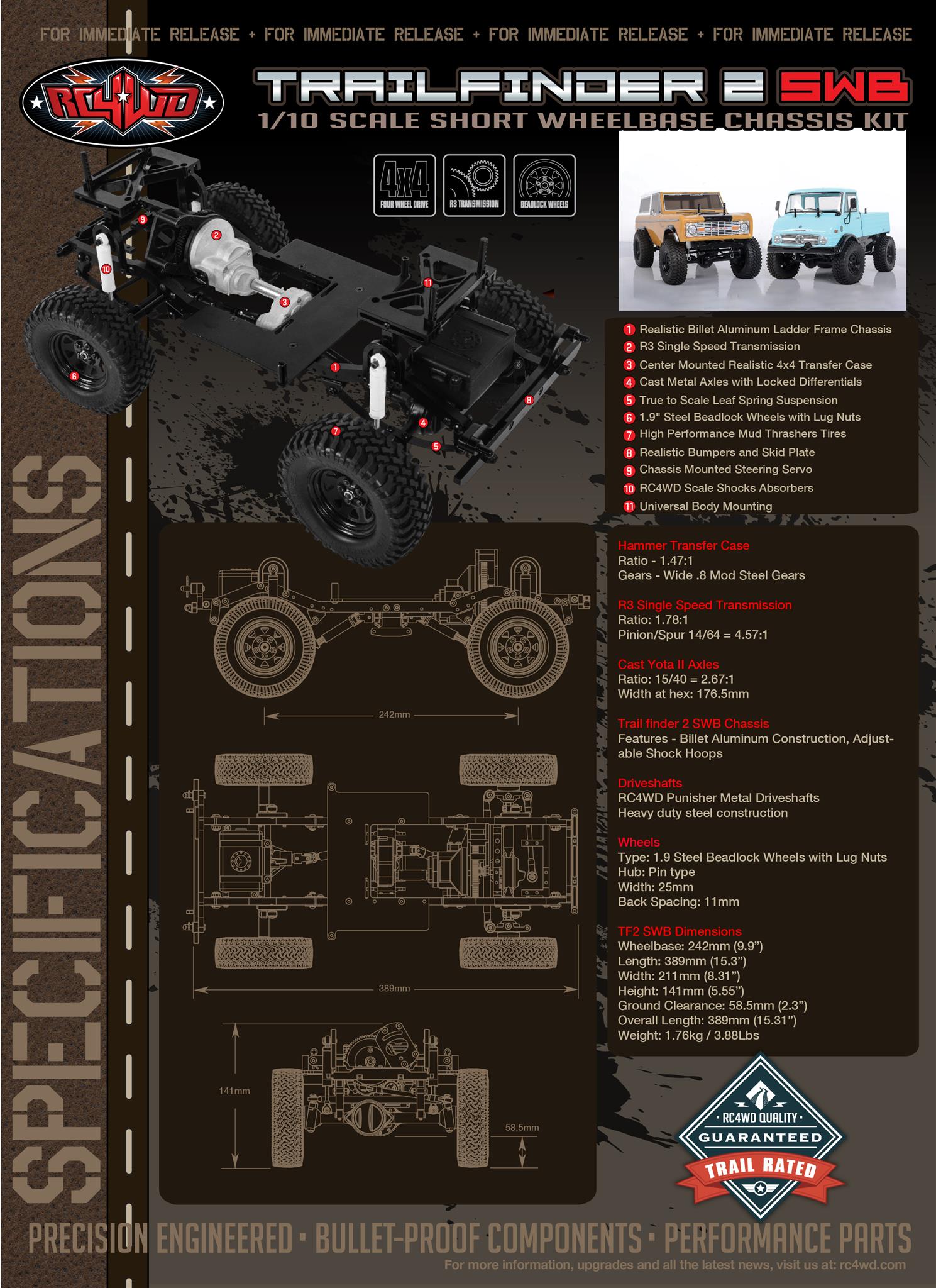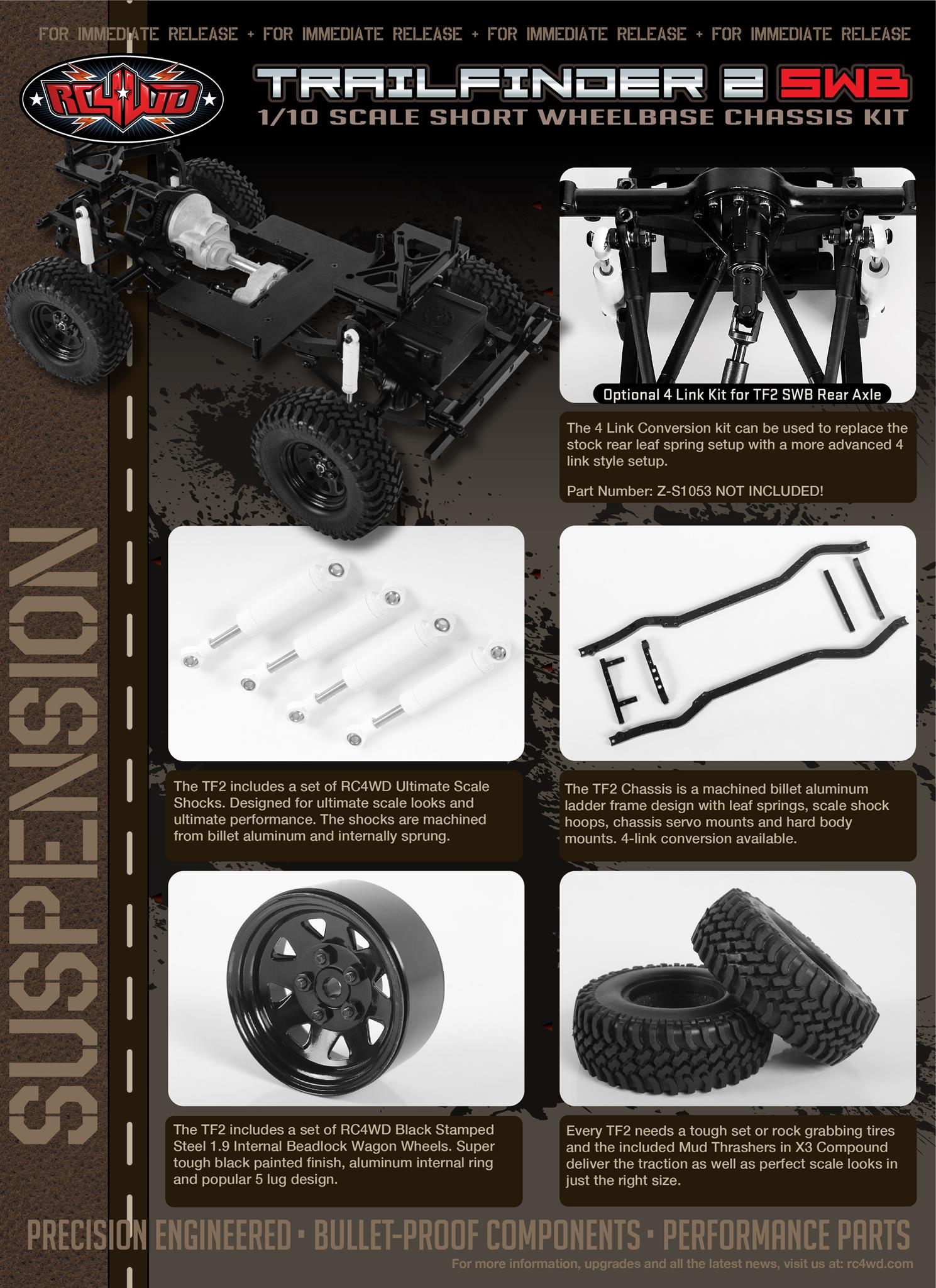 • The TF2 Chassis is a machined billet aluminum ladder frame design with leaf springs, scale shock hoops, chassis servo mounts and hard body mounts. 4-link conversion available