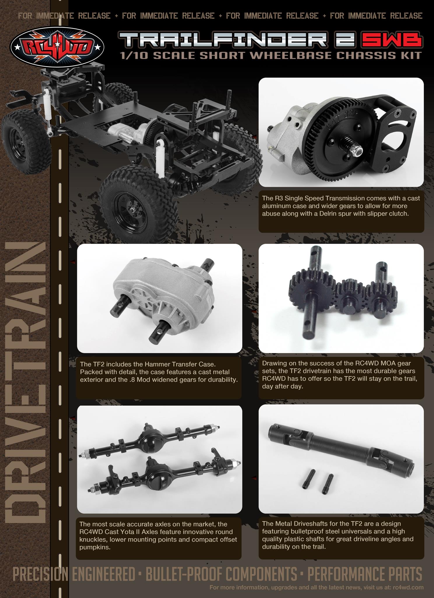 • Drawing on the success of the RC4WD MOA gear sets, the TF2 drivetrain has the most durable gears RC4WD has to offer so the TF2 will stay on the trail, day after day.