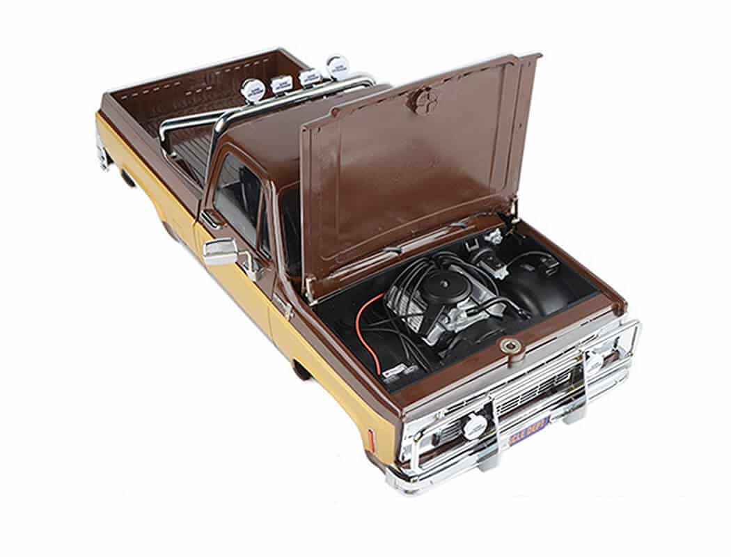 The Chevrolet K10 Scottsdale features exquisite scale details, including door handles, updated mirrors, new rear step bumper and the new front grille. It also has a complete molded plastic engine bay that comes painted with decals installed for an extremely scale appearance.