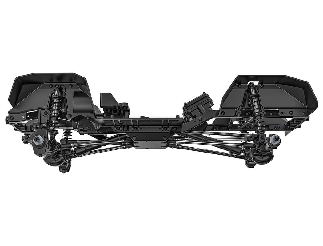With strength in mind, the ladder frame design of the Trail Finder 2 is made with CNC machined, billet aluminium and comes with scale shock hoops, a chassis servo mount, and transmission and transfer case mounts.