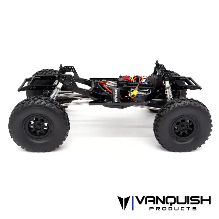 The Vanquish Products VRD RTR chassis is equipped with all new molded chassis components that provide a tunable platform to adapt to the most demanding terrain. Multiple shock and body mounting positions combined with minimalistic front/rear interchangeable bumpers make body mounting and fitment straight forward. Stamped aluminum rock sliders provide a flat location for electronics and/or battery mounting and are able to support and protect your body.