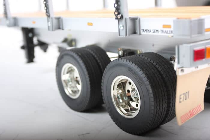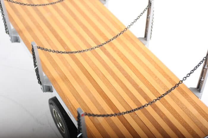 This highly realistic 1/14 scale flatbed semi-trailer model is for use in combination with Tamiya’s 1/14 scale R/C tractor trucks. A scale appearance is achieved by using authentic components such as aluminium chassis/frame, wood-floored platform and actual chains.