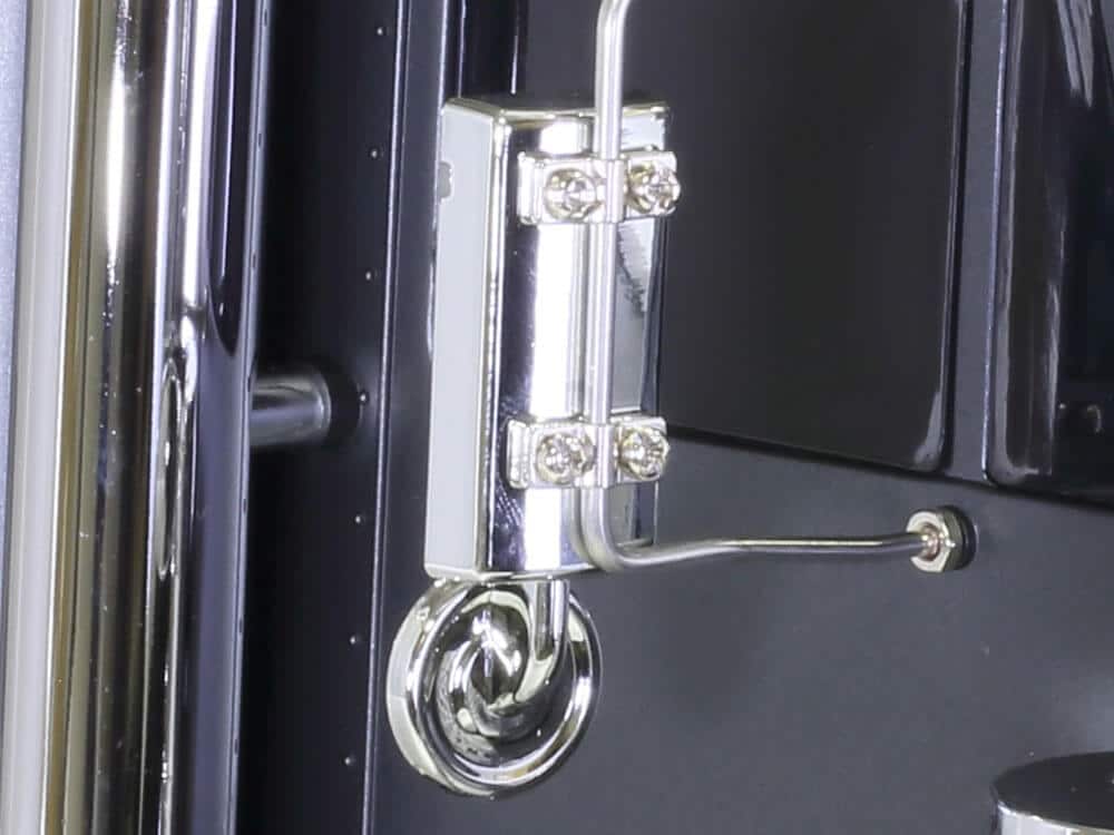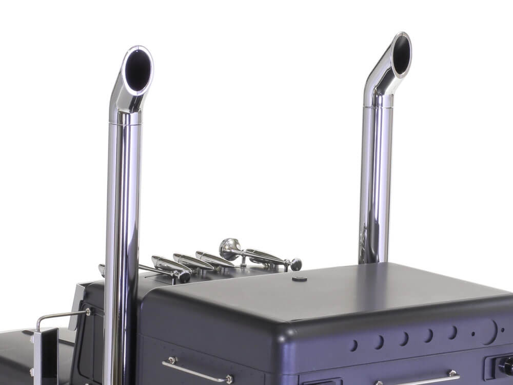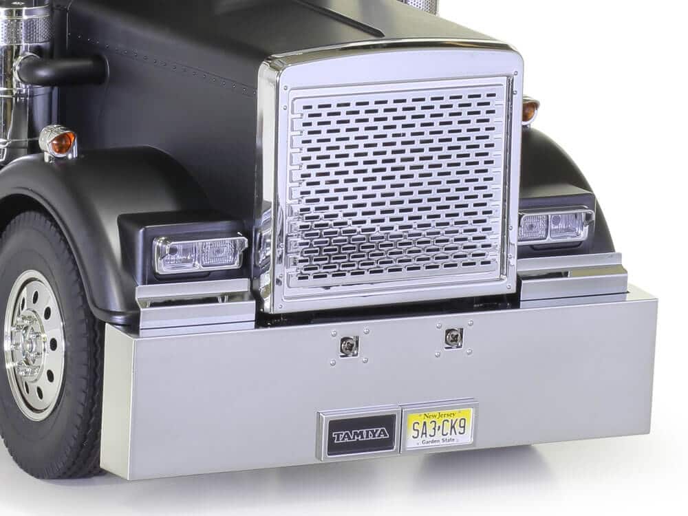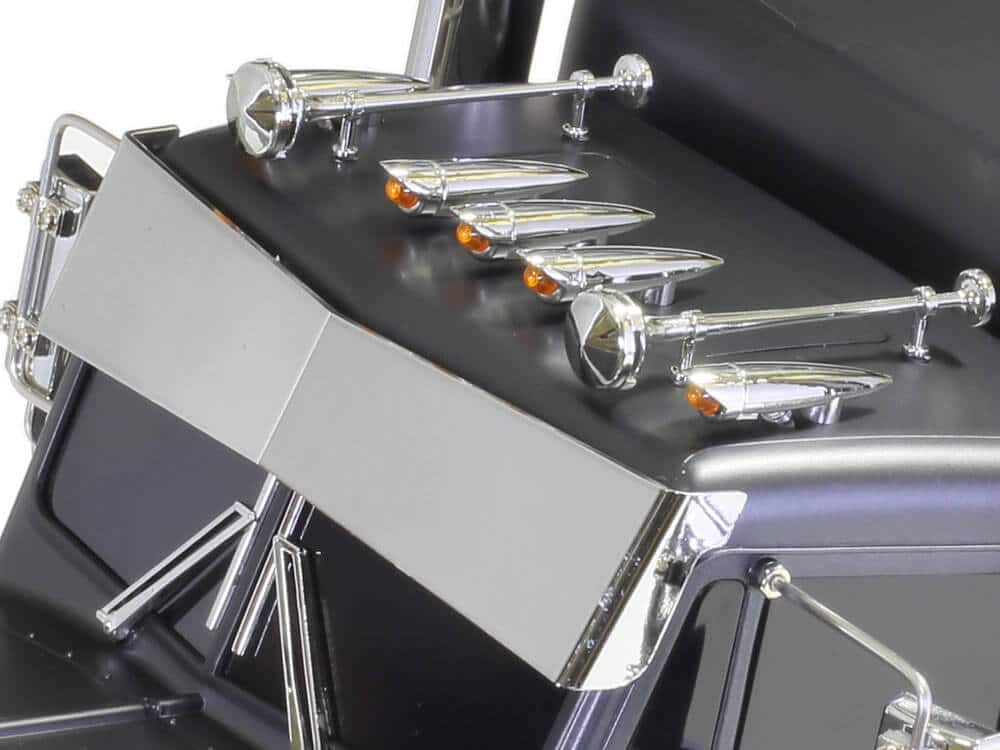The model’s ladder frame chassis features aluminium side channels with resin cross members and is equipped with a highly realistic suspension utilizing metal leaf springs and friction dampers. A front-mounted motor and 3-speed transmission power the two rear wheel axles, which are fitted with built-in differentials to enable smooth cornering. A 4-channel R/C system and multi-function unit allow you to drive the vehicle and experience realistic lights, sounds and vibrations. (Both sold separately)