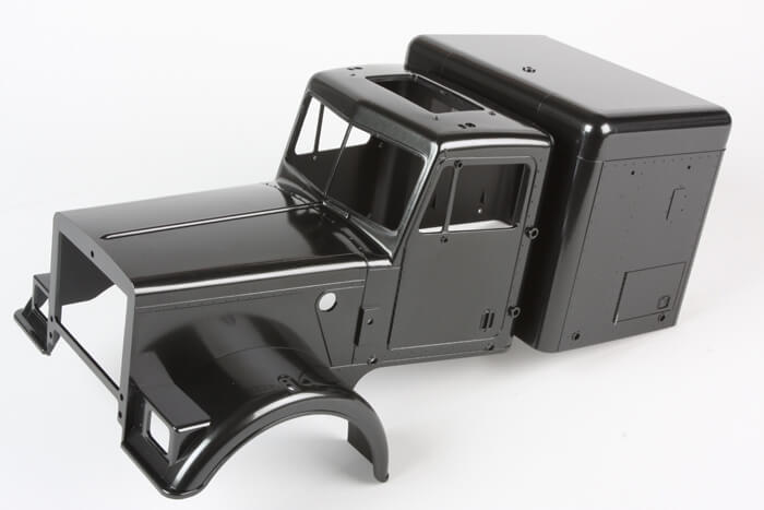 This R/C model assembly kit features a precision-moulded tractor truck body with pre-painted metallic black parts offset by chrome-plated parts such as the front grille, air cleaners and more. The tough ladder frame chassis is paired with front and rear metal leaf spring dampers for excellent performance and durability. The front-mounted motor provides power to the rear wheels via propeller shaft, mirroring the system used on actual road-going trucks, and utilizes a 3-speed transmission with manually-controllable gear changes.