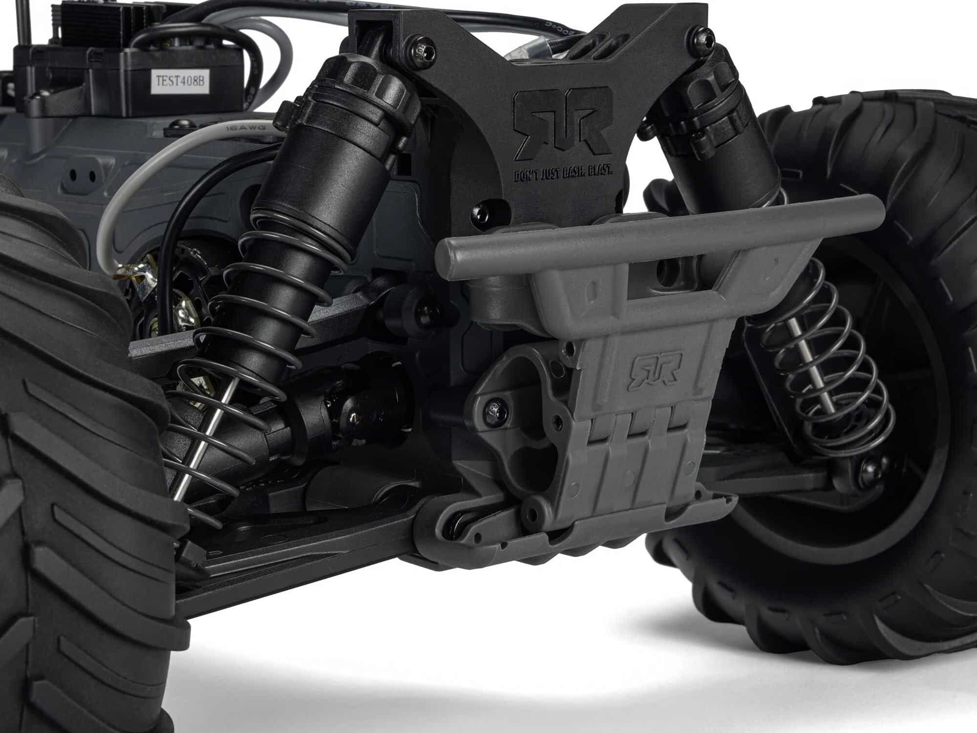 Go ahead and send it over punishing tracks. Proven ARRMA engineering gives the composite chassis bash-it-all durability. The independent suspension, oil-filled shocks, and adjustable ride height combine to provide a smooth ride over rough terrain. For unstoppable traction, the ARRMA GORGON monster truck’s 2WD transmission moves power from the MEGA 550 motor to massive rubber dBoots Chevron tyres on tough nylon wheels. Its metal gears are tough enough to take on brushless power, too. A new, mesh safe plate is also installed for additional gear protection and durability.
