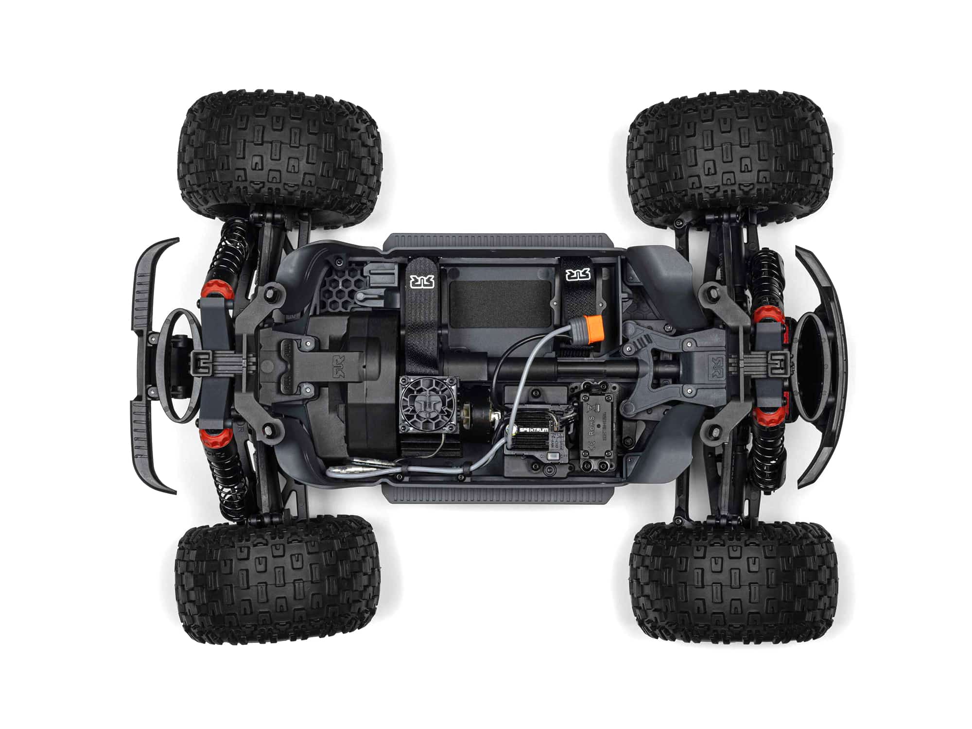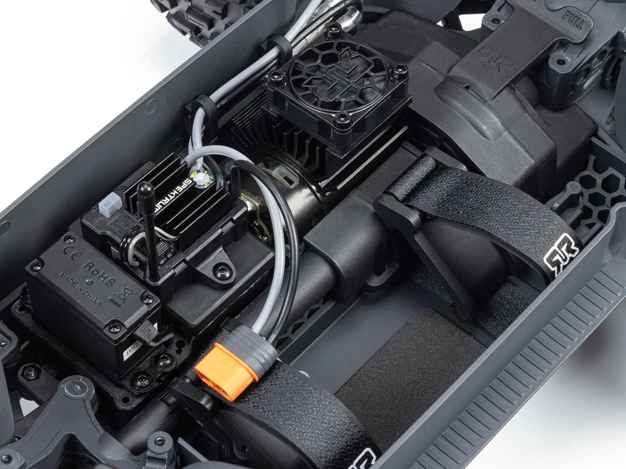 The durable chassis is ventilated to keep on-board components cool. Larger side guards provide maximum protection from dirt and debris. Stealth monochrome electronics are included for good looks, and the battery straps adjust to accept your choice of 2S hardcase LiPo battery.