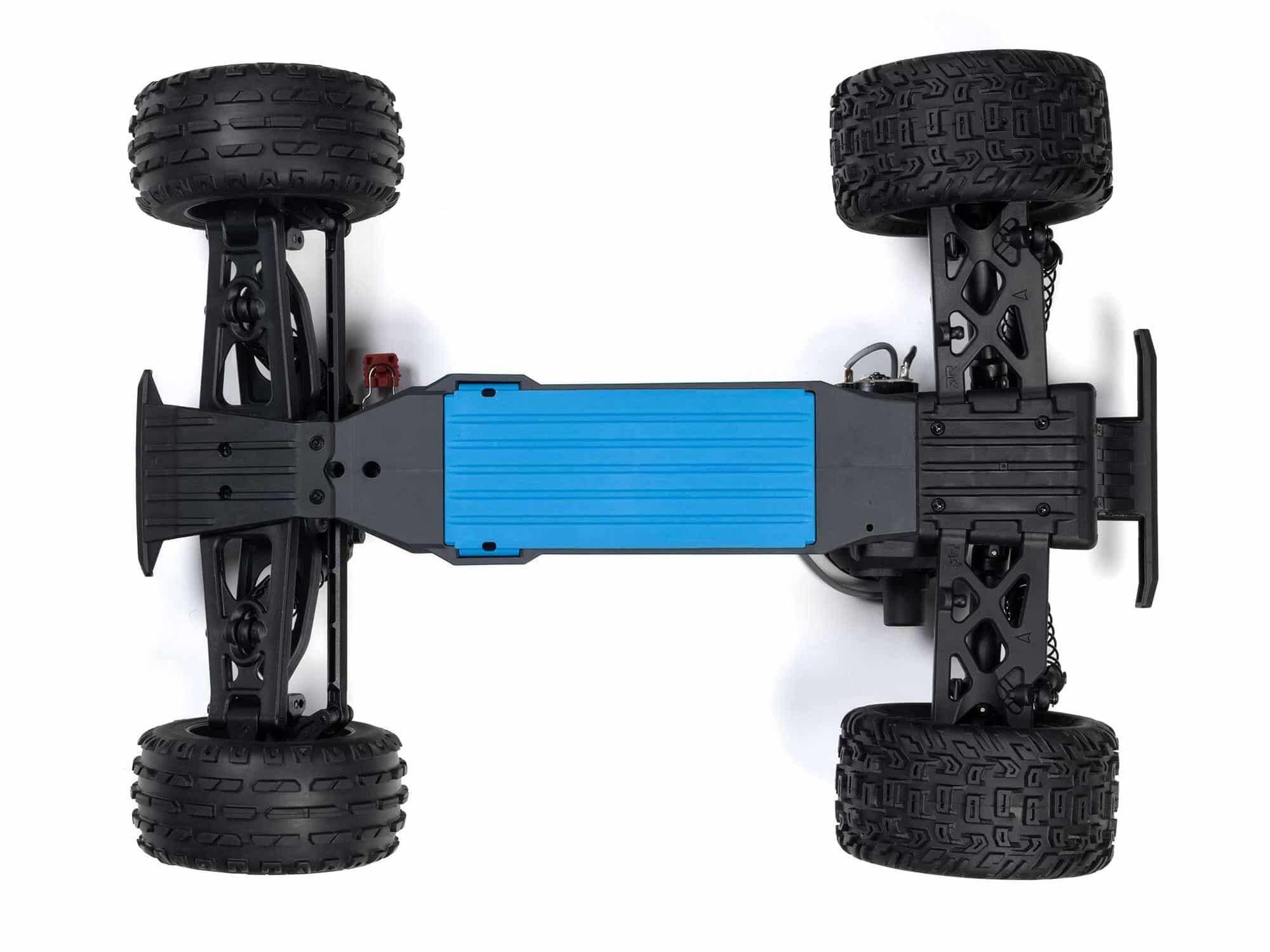 Proven ARRMA engineering gives the composite chassis the durability for bashing over punishing surfaces. The independent suspension, oil-filled shocks, and adjustable ride height combine to provide a smooth ride over uneven terrain. For unstoppable traction, the stadium truck’s metal gear differential moves power from the installed MEGA 550 motor to the all-terrain rear tyres.